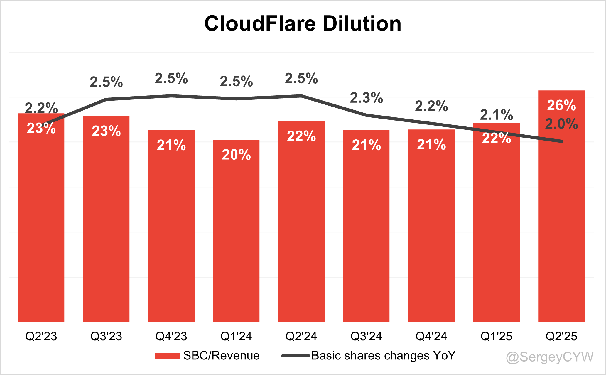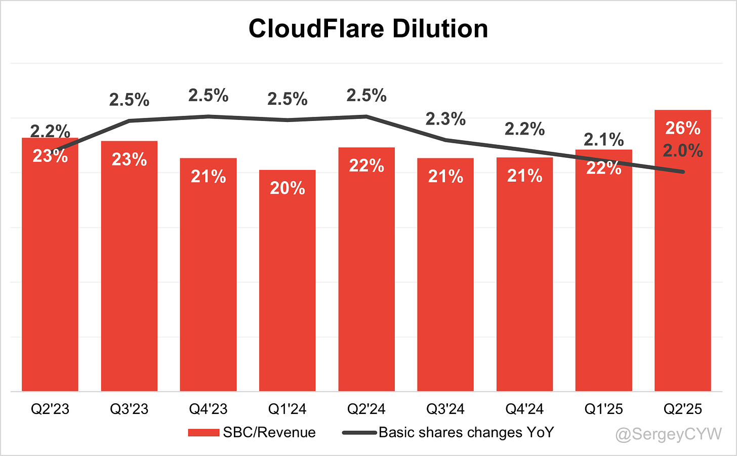 $NET Shareholder Dilution: Cloudflare's stock-based compensation (SBC) expenses slightly increased in the last quarter to 26% of revenue.