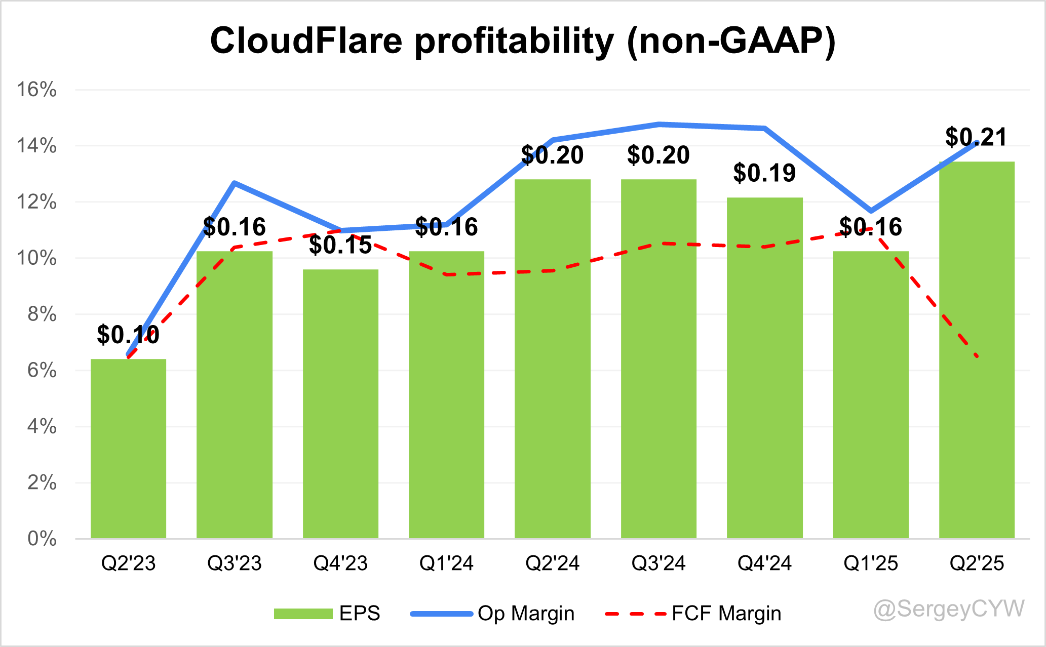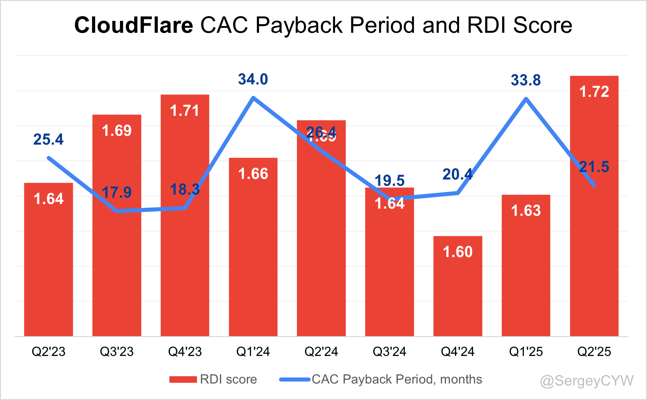 $NET Cloudflare's return on S&M spending is 21.5, which is at the 21.5 median level for the SaaS companies I track.