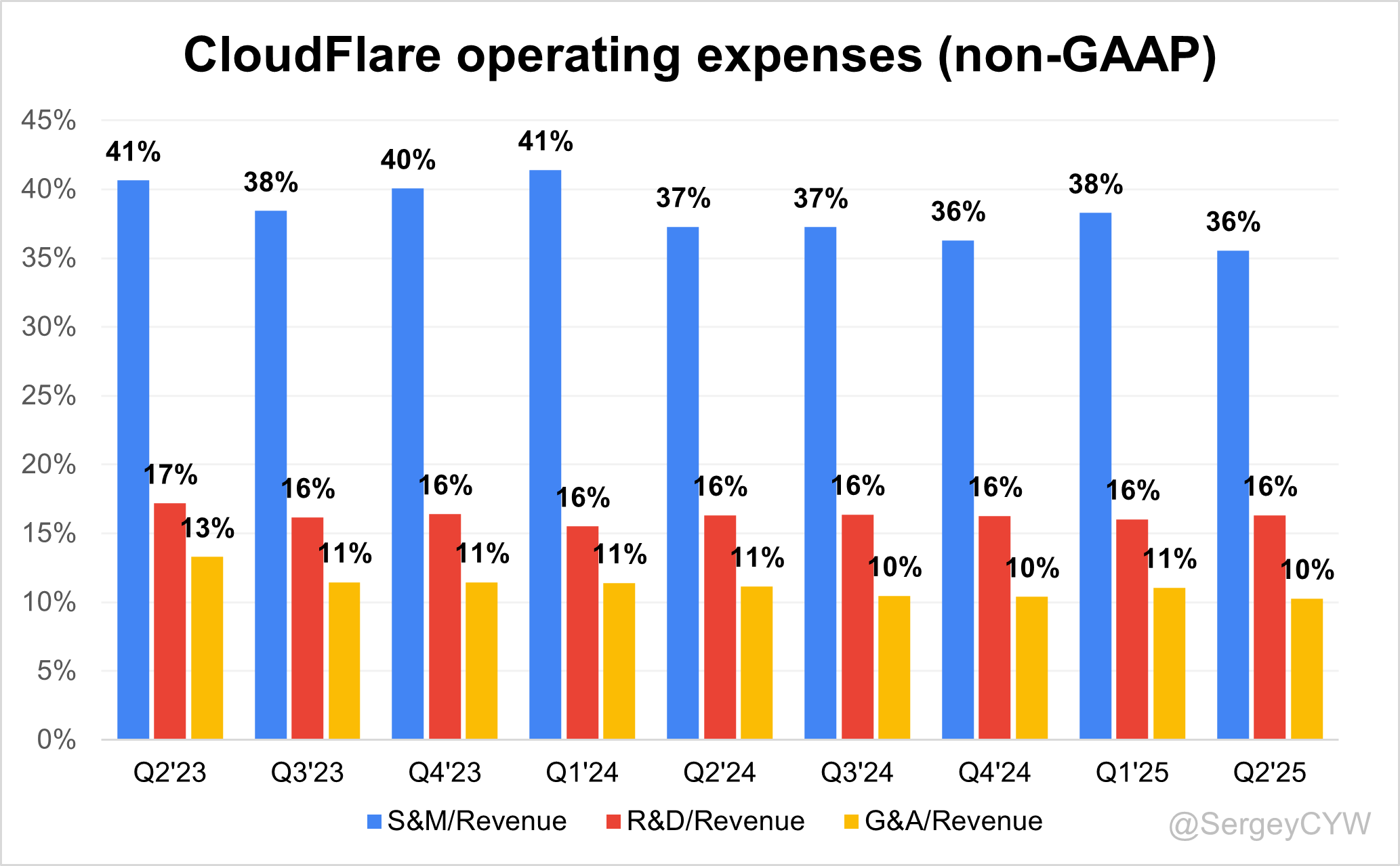 $NET Cloudflare's operating expenses have decreased over the past two years, primarily due to reduced S&M spending. S&M expenses declined from 41% to 36% of revenue.