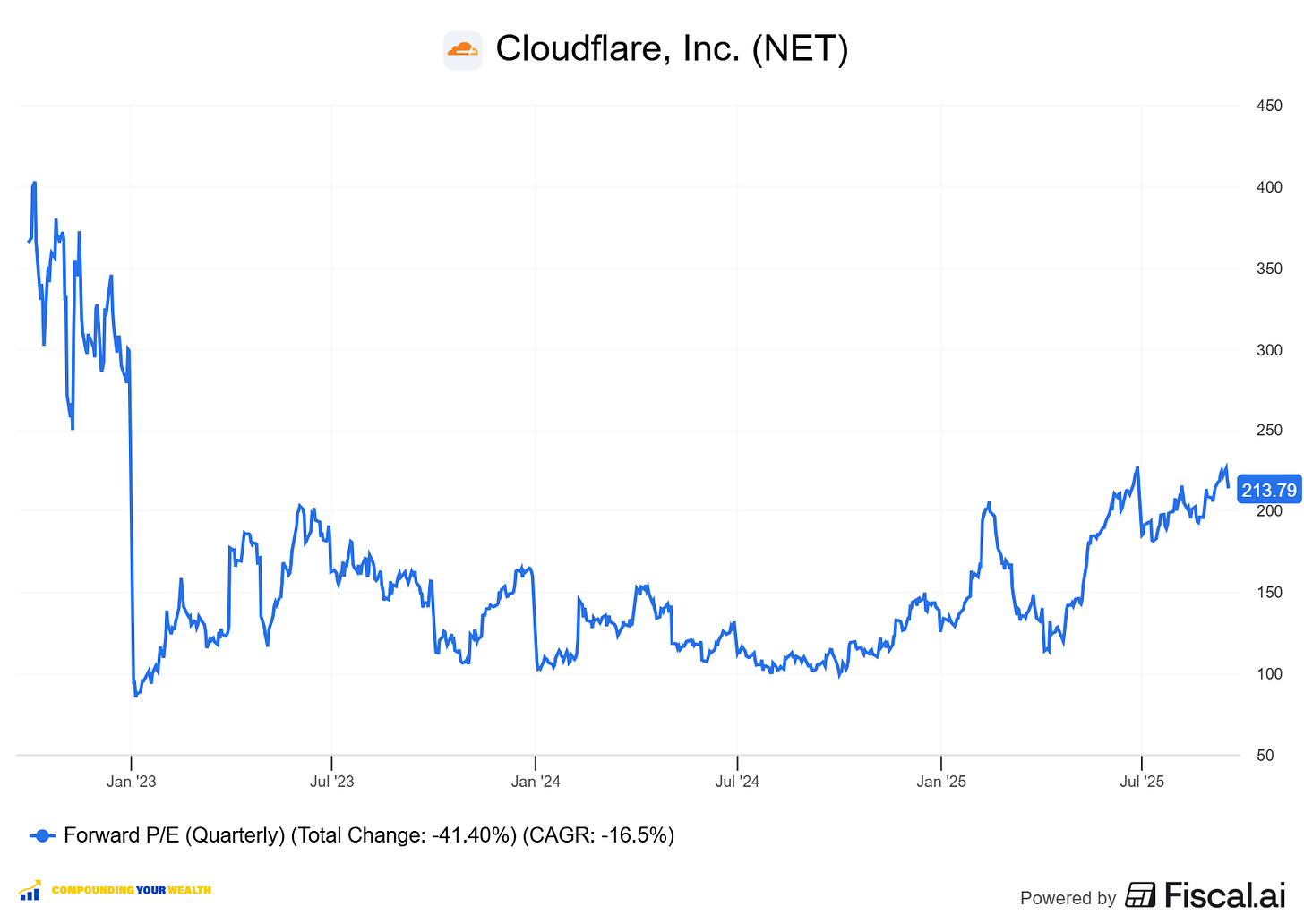 $NET trades at a Forward P/E of 213.8, with revenue growth of 27.8% YoY in the last quarter. This forward P/E is 7.7x the anticipated revenue growth rate. The multiple remains elevated as the company reinvests heavily in R&D and S&M, reflecting its earlier stage of growth.