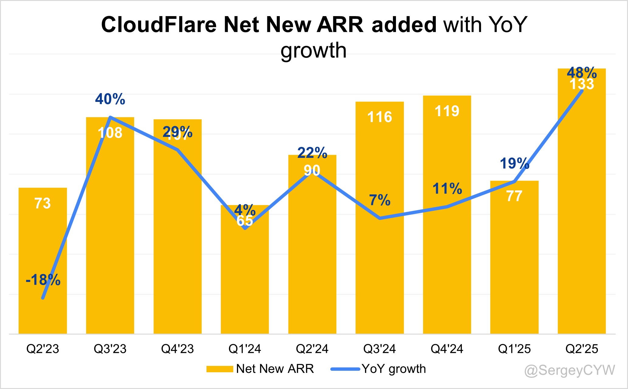 $NET Cloudflare added a record number $133M in net new ARR in Q2 2025, with growth of +48% YoY.