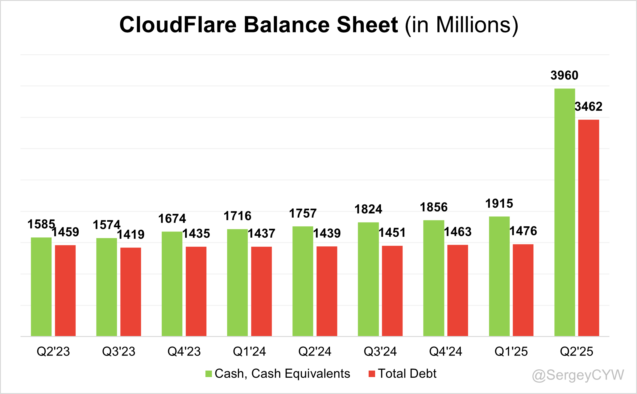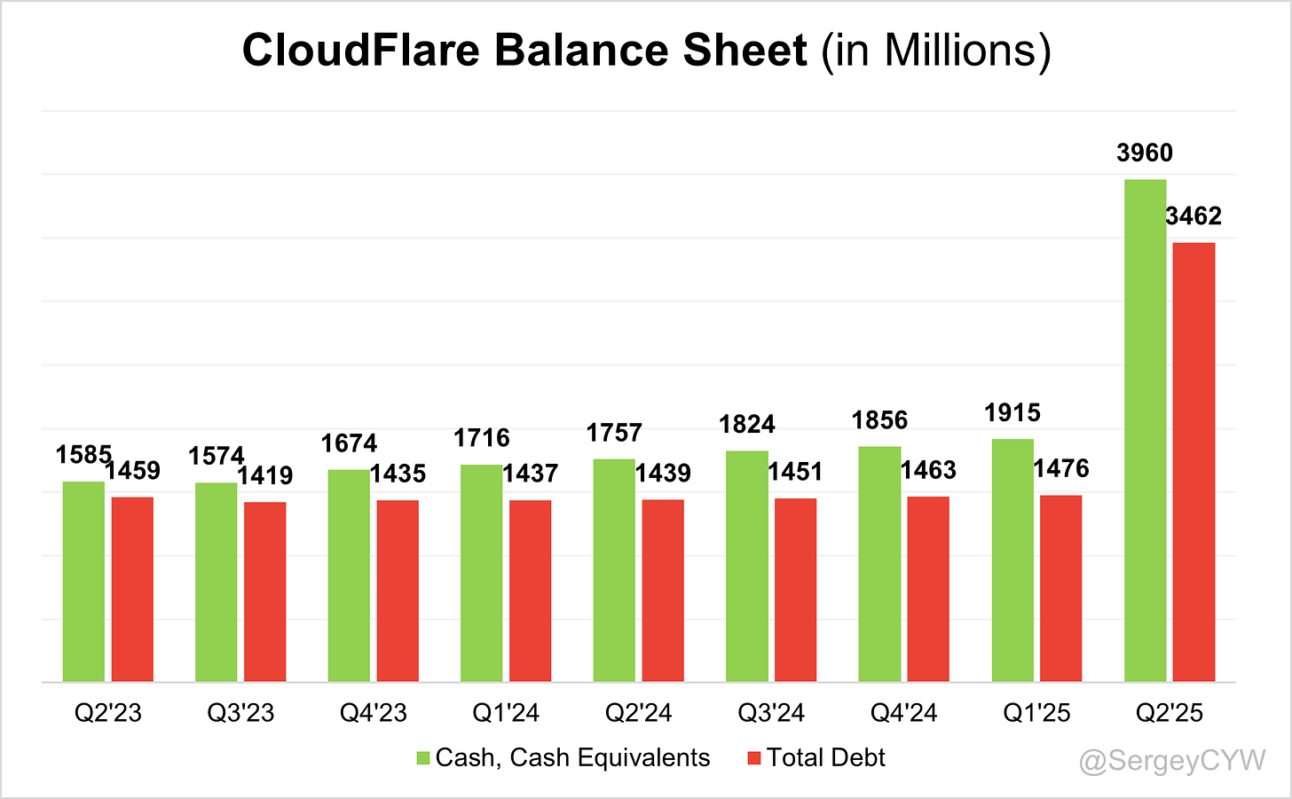 $NET Balance Sheet: Total debt stands at $3,462M, while Cloudflare holds $3,960M in cash and cash equivalents, exceeding total debt and ensuring a healthy balance sheet.