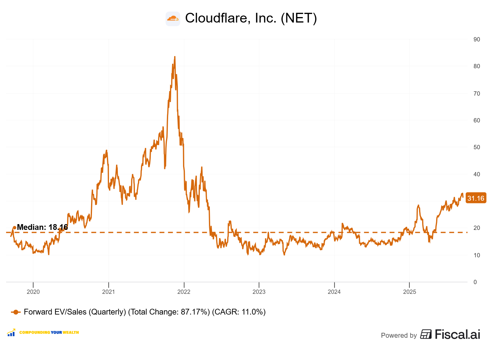 $NET Cloudflare is trading at a Forward EV/Sales multiple of 31.1, which is above the median of 18.1. The lowest Forward EV/Sales in 2025 was recorded in March 2025 at around 15. The company’s valuation has increased significantly over the past months.