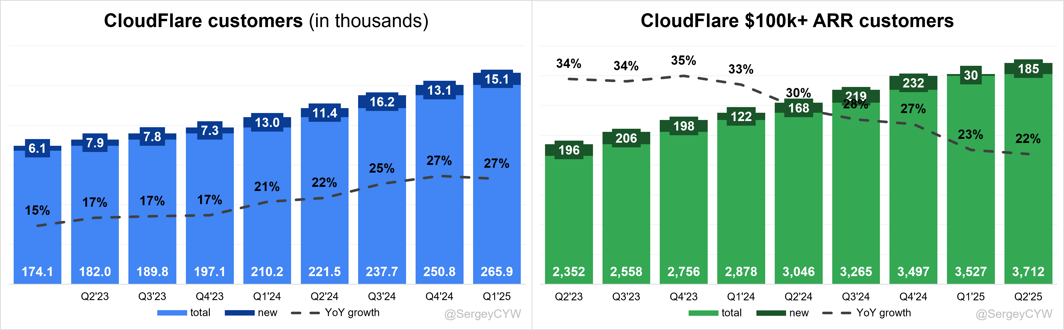 $NET Cloudflare added a record 15,100 new customers, with customer growth accelerating to +27% YoY. Large customer additions (ARR over $100K) in Q2 were also strong at +185, higher than last year, and large customer growth remains solid at +22% YoY.