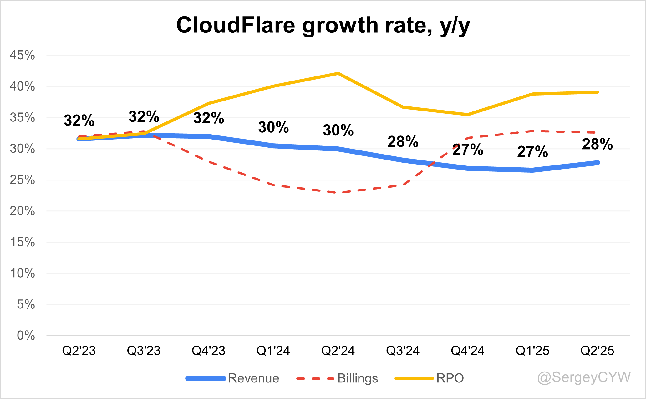 The revenue growth of $NET Cloudflare accelerates to +27,8% YoY in Q2. Based on the forecast for the next quarter, if the company beats its guidance by 2.3%, as it did in Q2, revenue growth would reach approximately 29.5%, indicating a potential acceleration.