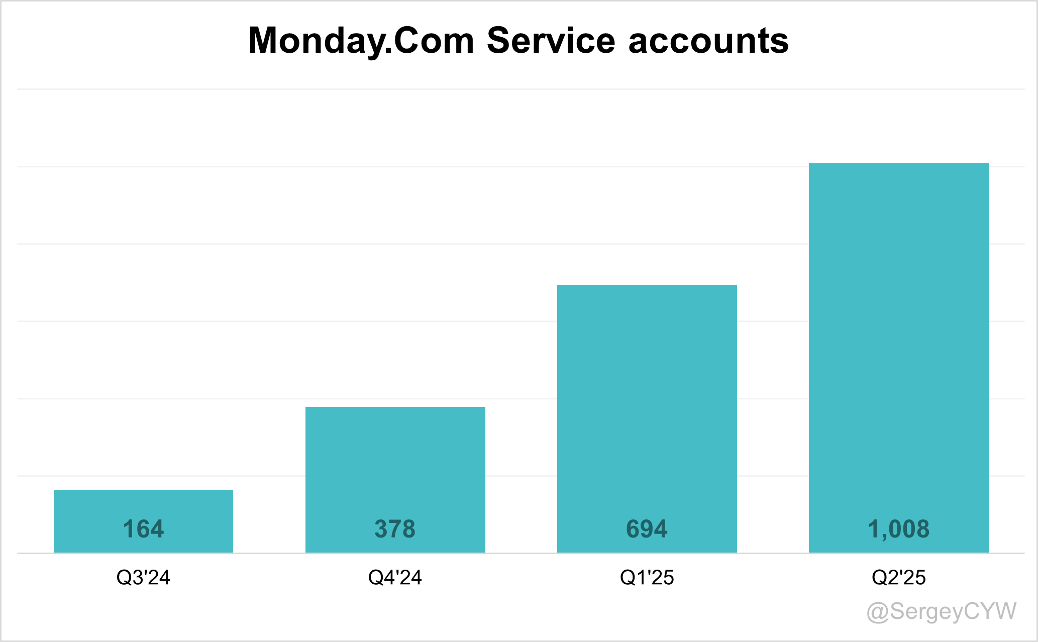 $MNDY Monday added 314 new Service accounts, in line with the previous quarter’s additions. Monday Service, launched in 2024, offers AI-powered enterprise service management and already shows strong traction. It has the highest ACV among all Monday products, and highlighting strong cross-sell potential across its platform.