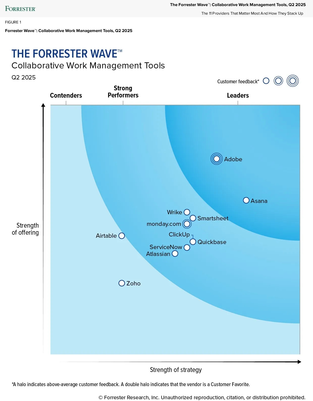 Monday was named a Strong Performer in the 2025 Forrester Wave for Collaborative Work Management Tools for the Enterprise. The evaluation covered 10 leading platforms, including Asana, Airtable, and Wrike.