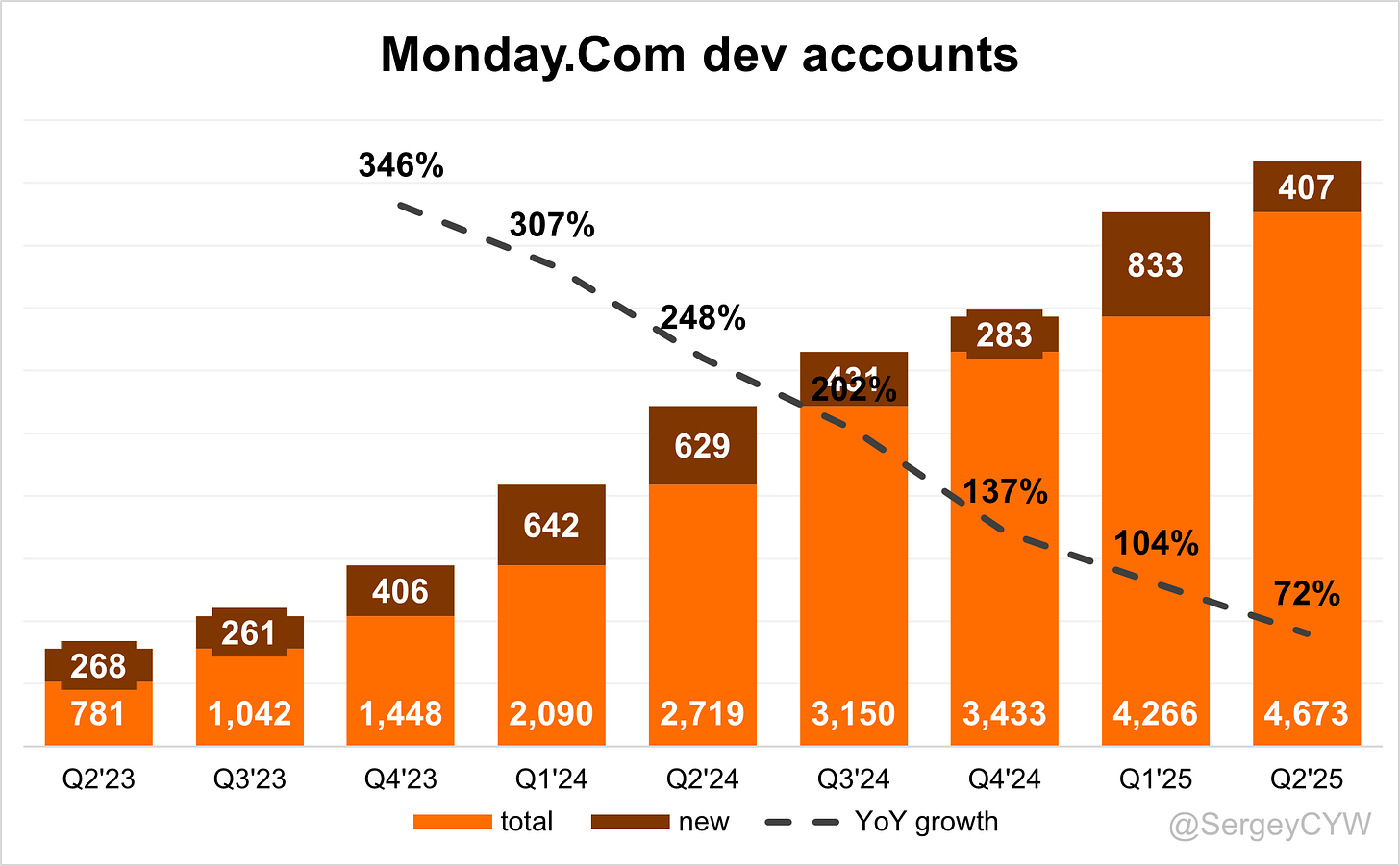 $MNDY added 407 new developer accounts, roughly in line with the average addition, with +72% YoY growth.