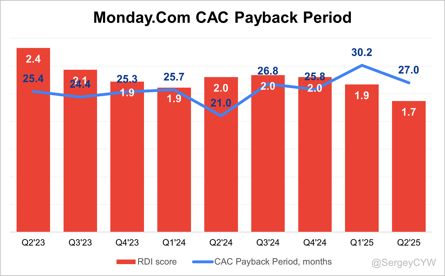 $MNDY Monday’s return on S&M spending improved to 27.0, which is worse than the SaaS median of 21.5.