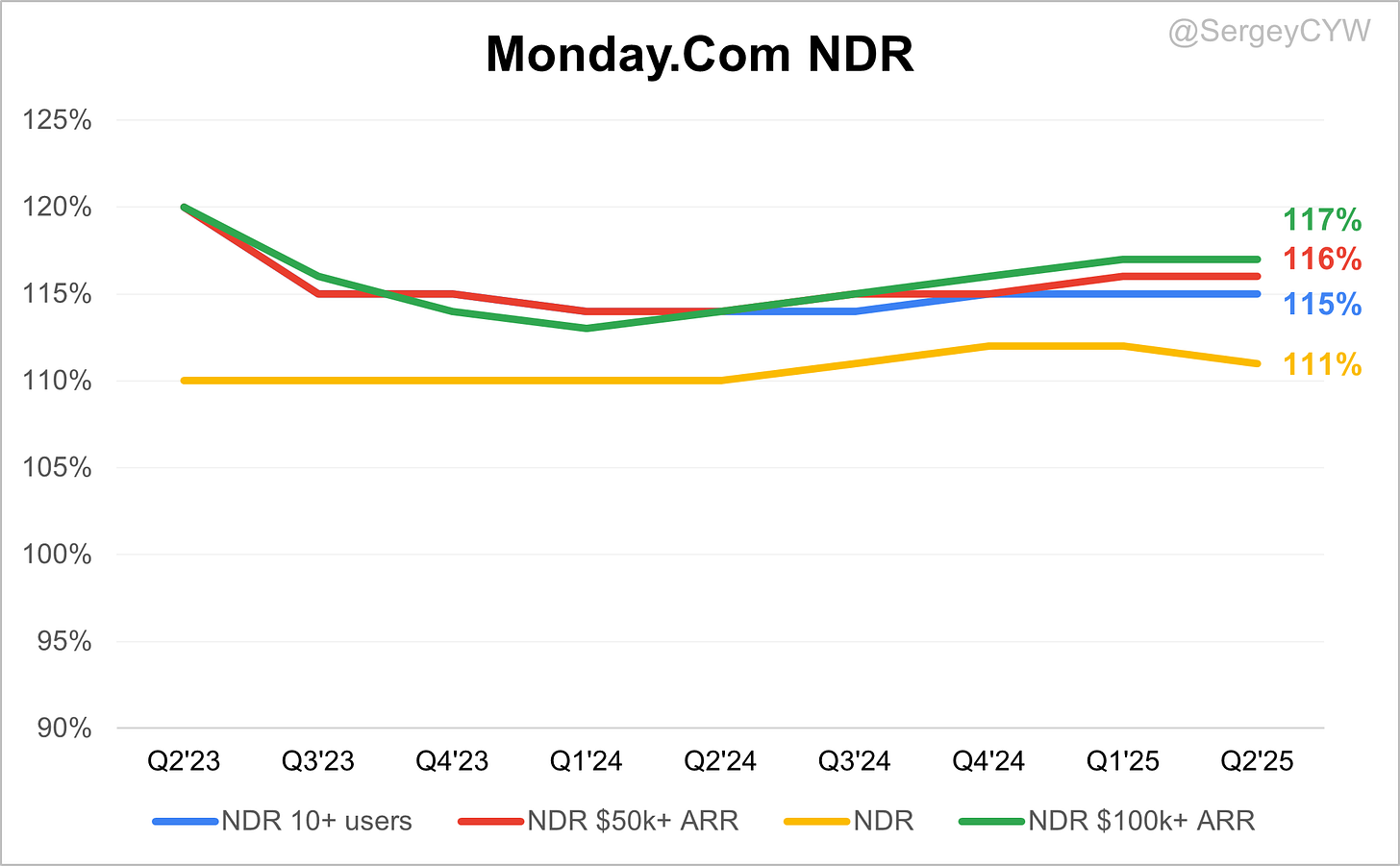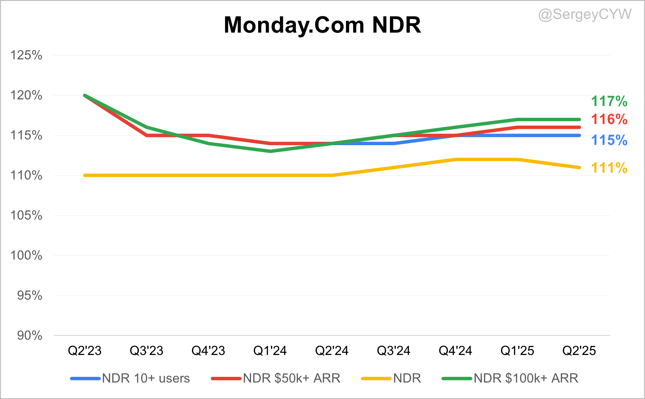 $MNDY Monday’s Net Dollar Retention (NDR) is slightly down to 111% from 112% in Q1. For customers with ARR over $50K, retention at 116%, and for $100K+ customers at 117%. While retention remains strong, it is slightly below the 120% median for SaaS companies I track.