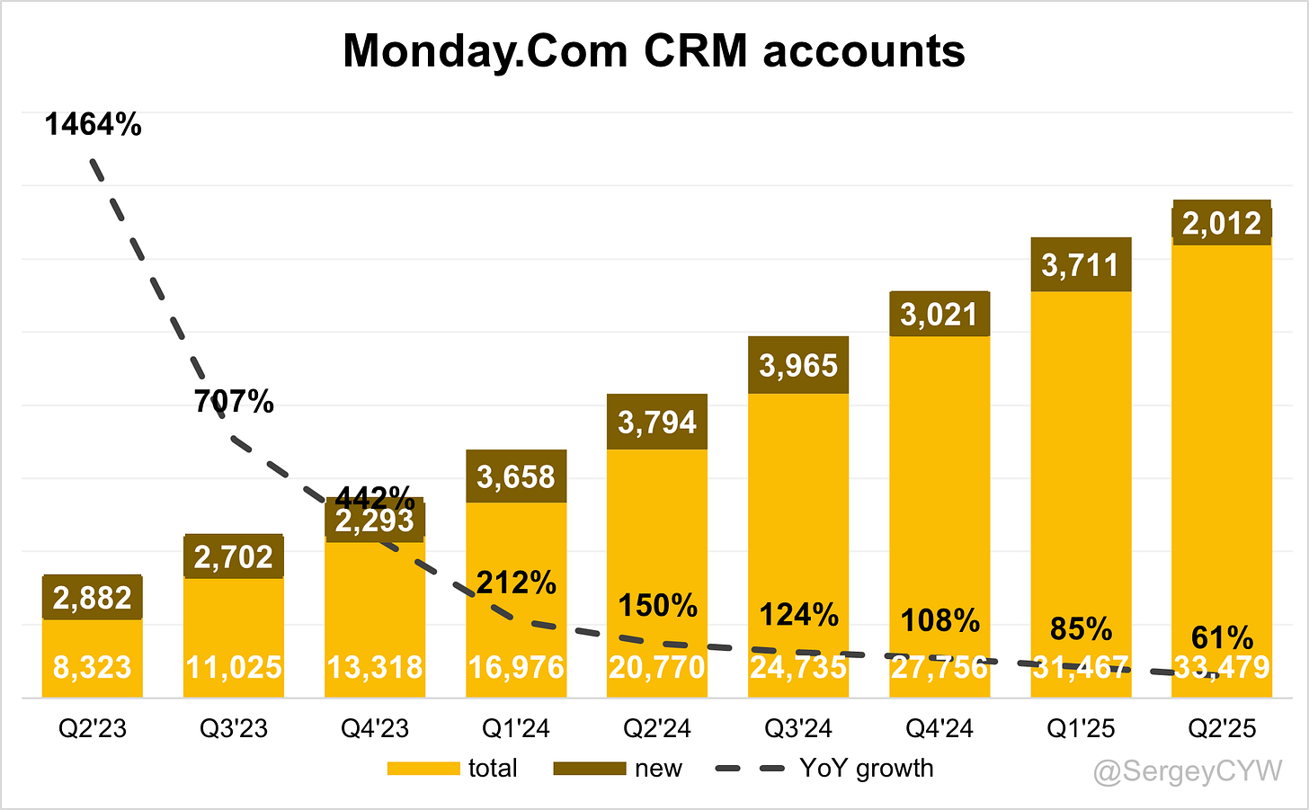 In Q2 2025, $MNDY added 2,012 new CRM accounts, representing +61% YoY growth. However, this was the lowest quarterly addition in the past two years and below the level of Q2 last year. Management explained the weaker additions as a mix of factors and seasonality: Q1 typically delivers stronger results, while Q2 is softer. The weakness was concentrated in the SMB segment, linked to recent Google search changes that affected top-of-funnel sales volume but not customer quality or churn. Demand in the enterprise and mid-market segments remained strong.