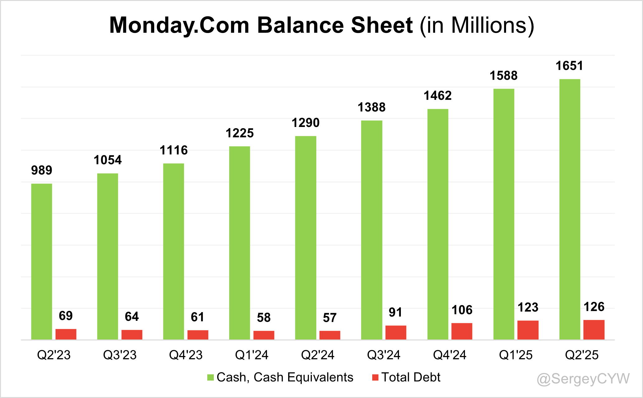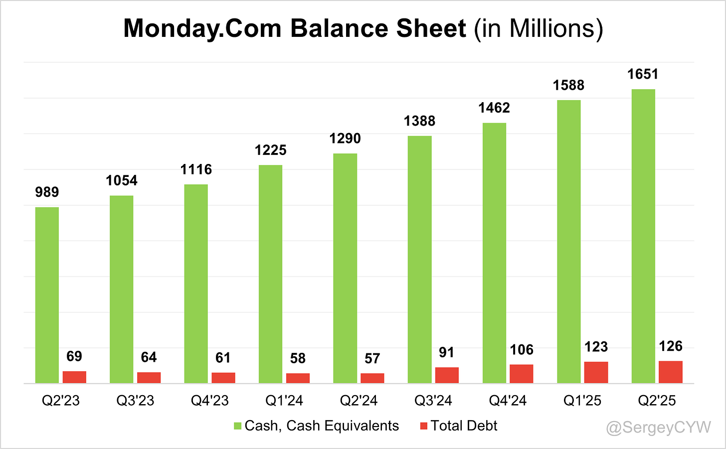 $MNDY Balance Sheet: Total debt stands at $126M, while Monday holds $1,651M in cash and cash equivalents, far exceeding its debt and ensuring a healthy balance sheet with virtually no debt.