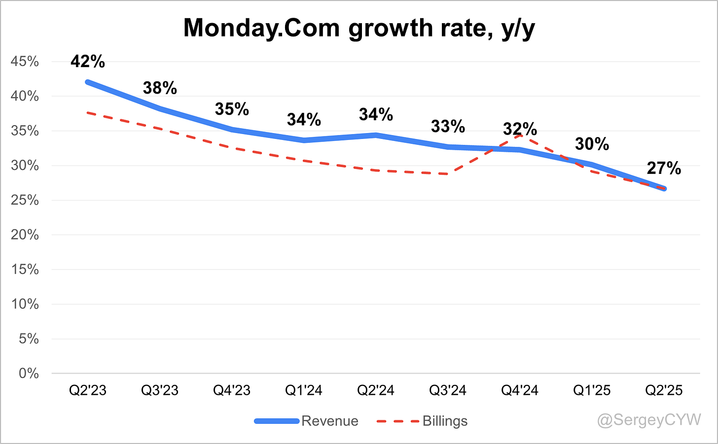 $MNDY Monday’s revenue growth remains consistently strong, though it slightly slowed to +26.6% YoY in Q2. Based on guidance for the next quarter, if the company beats its forecast by the same 1.7% as in Q2, Q3 growth would reach 26.8%, signaling a stabilization in revenue growth.