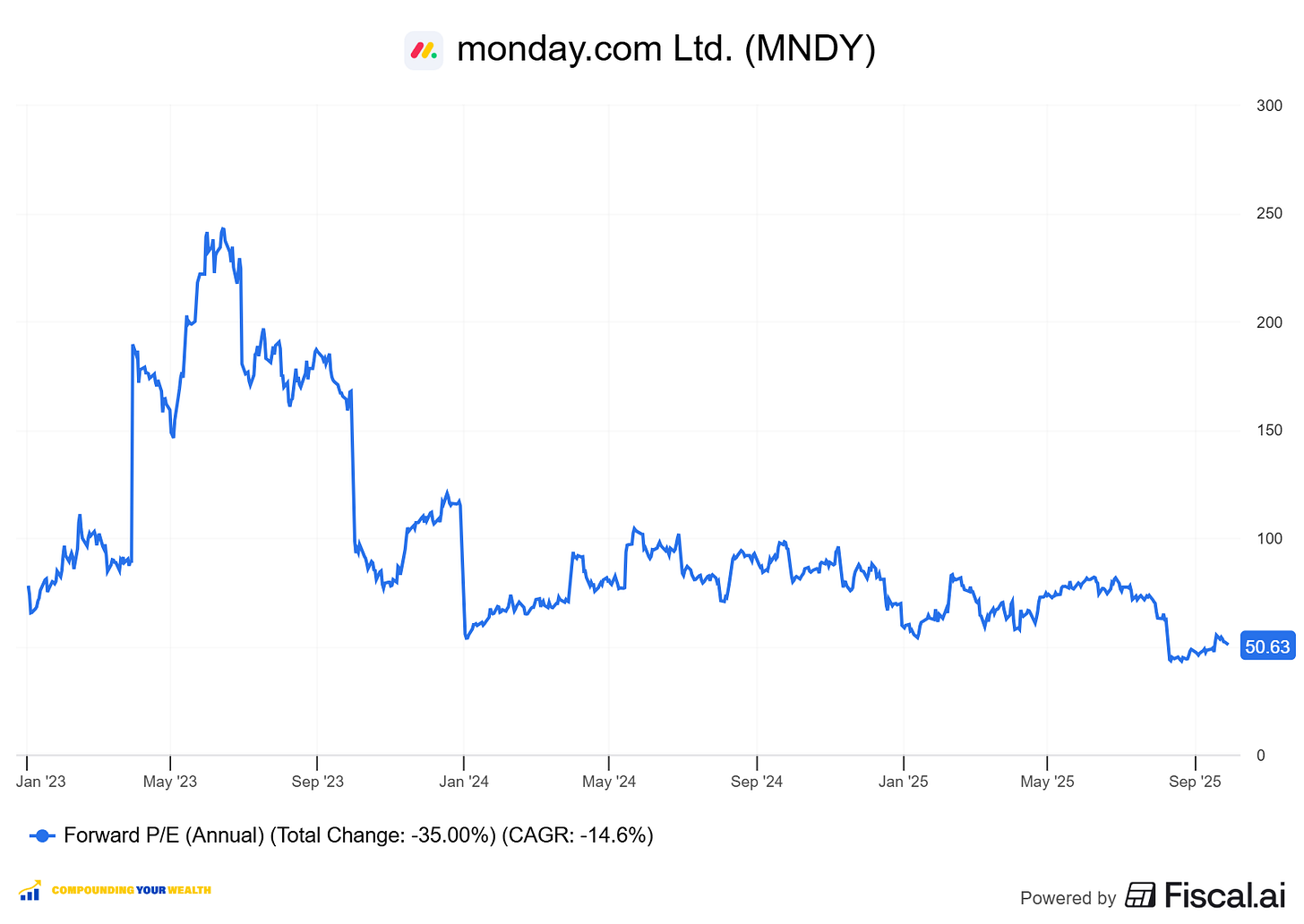 $MNDY trades at a Forward P/E of 50.6, with revenue growth of +26.6% YoY in the last quarter. This forward P/E ratio is 1.9 times the anticipated revenue growth rate.
