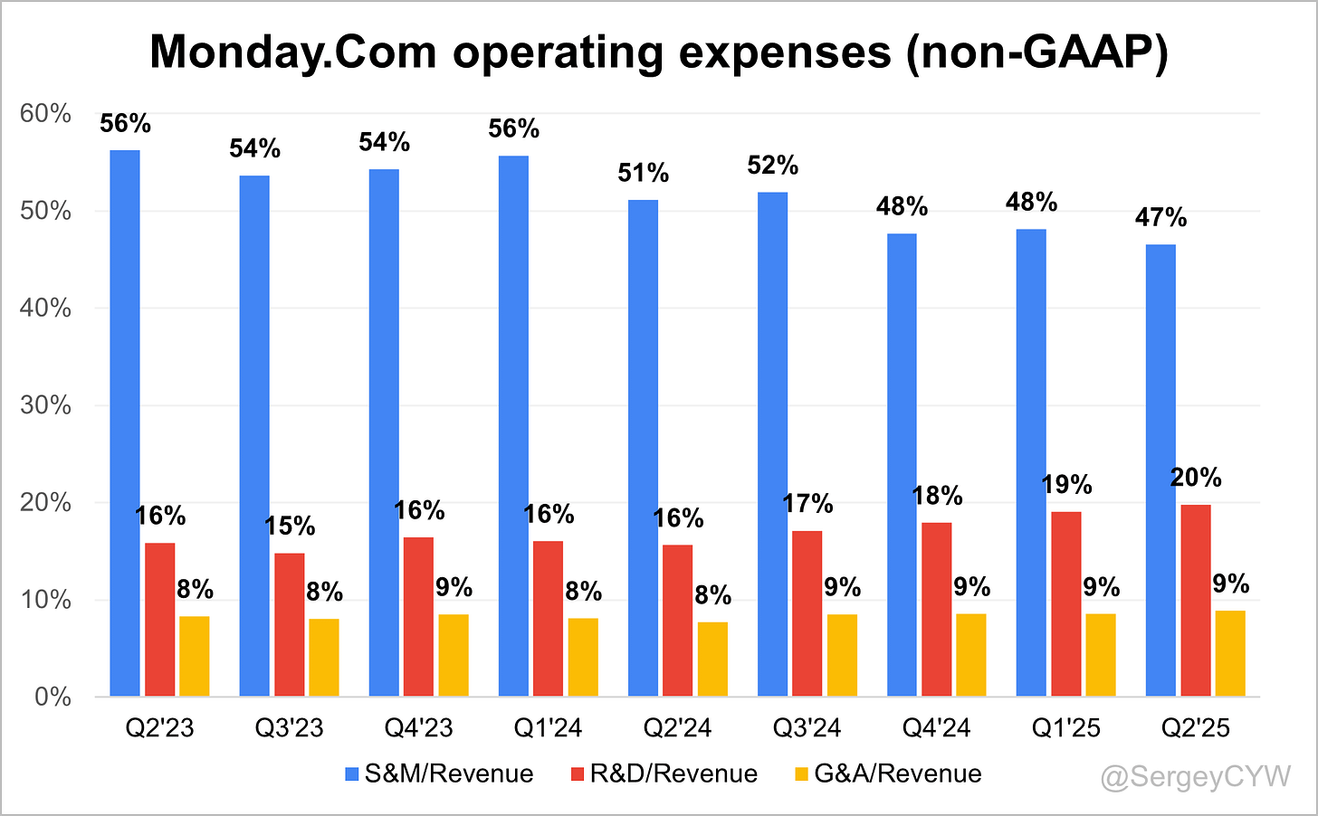 $MNDY Monday’s Non-GAAP operating expenses have gradually decreased due to a reduction in Sales & Marketing (S&M) spending, which declined from 56% two years ago to 47%.