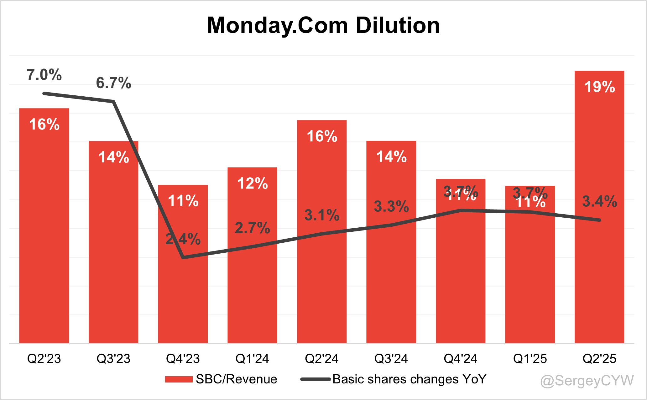 $MNDY Shareholder Dilution: Monday’s stock-based compensation (SBC) expenses rose to 19% of revenue in the last quarter, roughly in line with other high-growth SaaS companies.