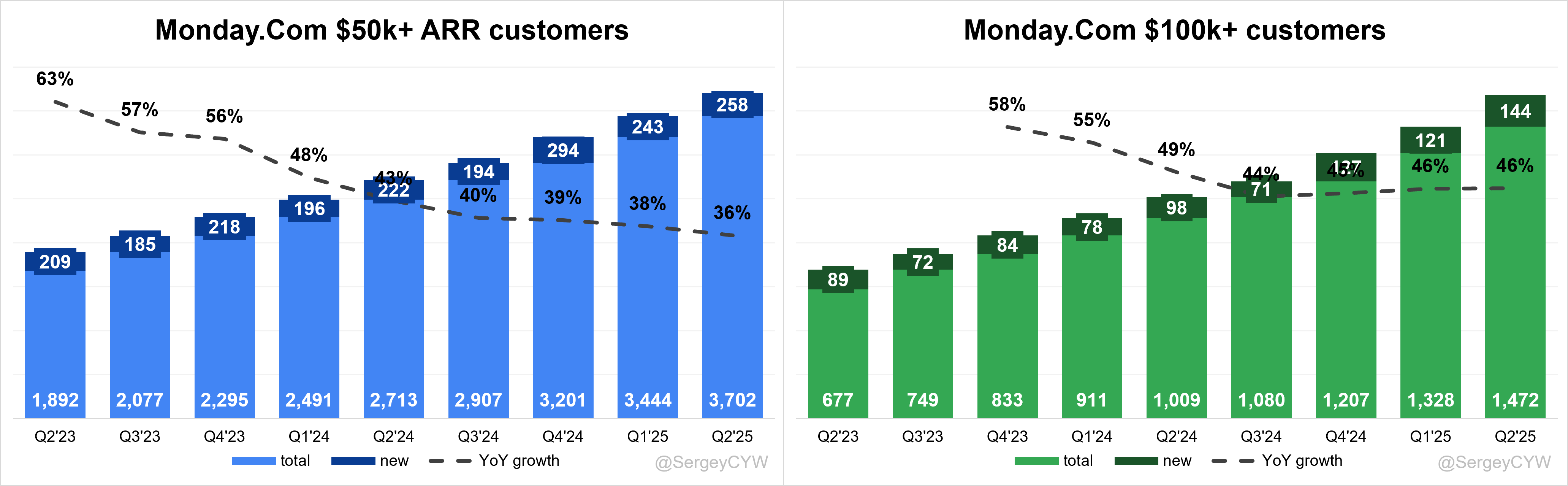 $MNDY Monday added 258 customers with ARR over $50K, representing +36% YoY growth and a record quarterly addition. The company also added 144 customers with ARR over $100K, showing +46% YoY growth — another record quarterly addition.