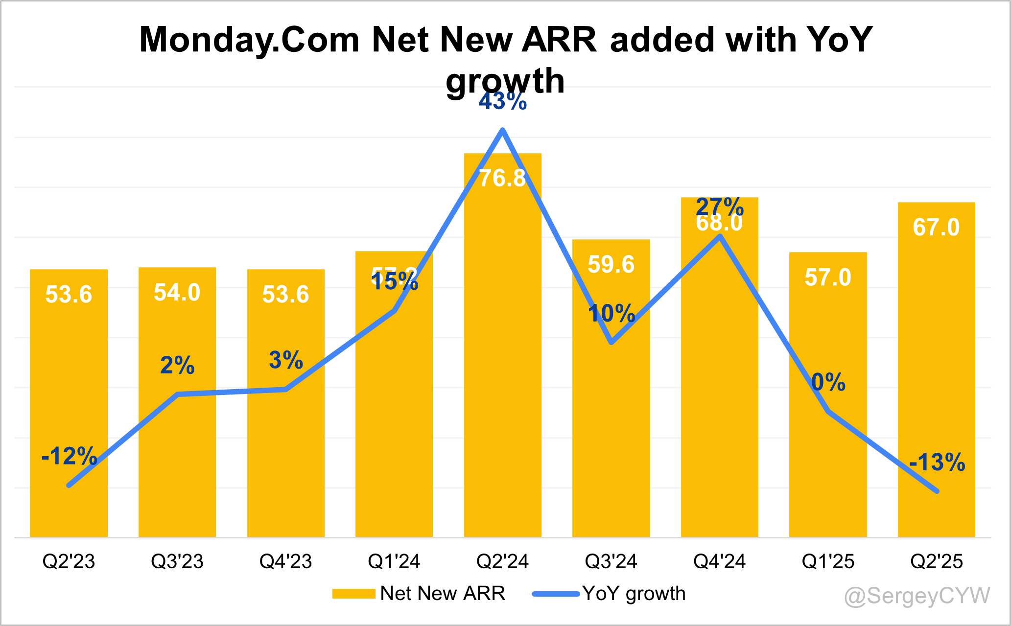 $MNDY Monday added $67M in net new ARR in Q2 2025, down -13% YoY. This addition is slightly above the two-year average, reflecting steady growth.