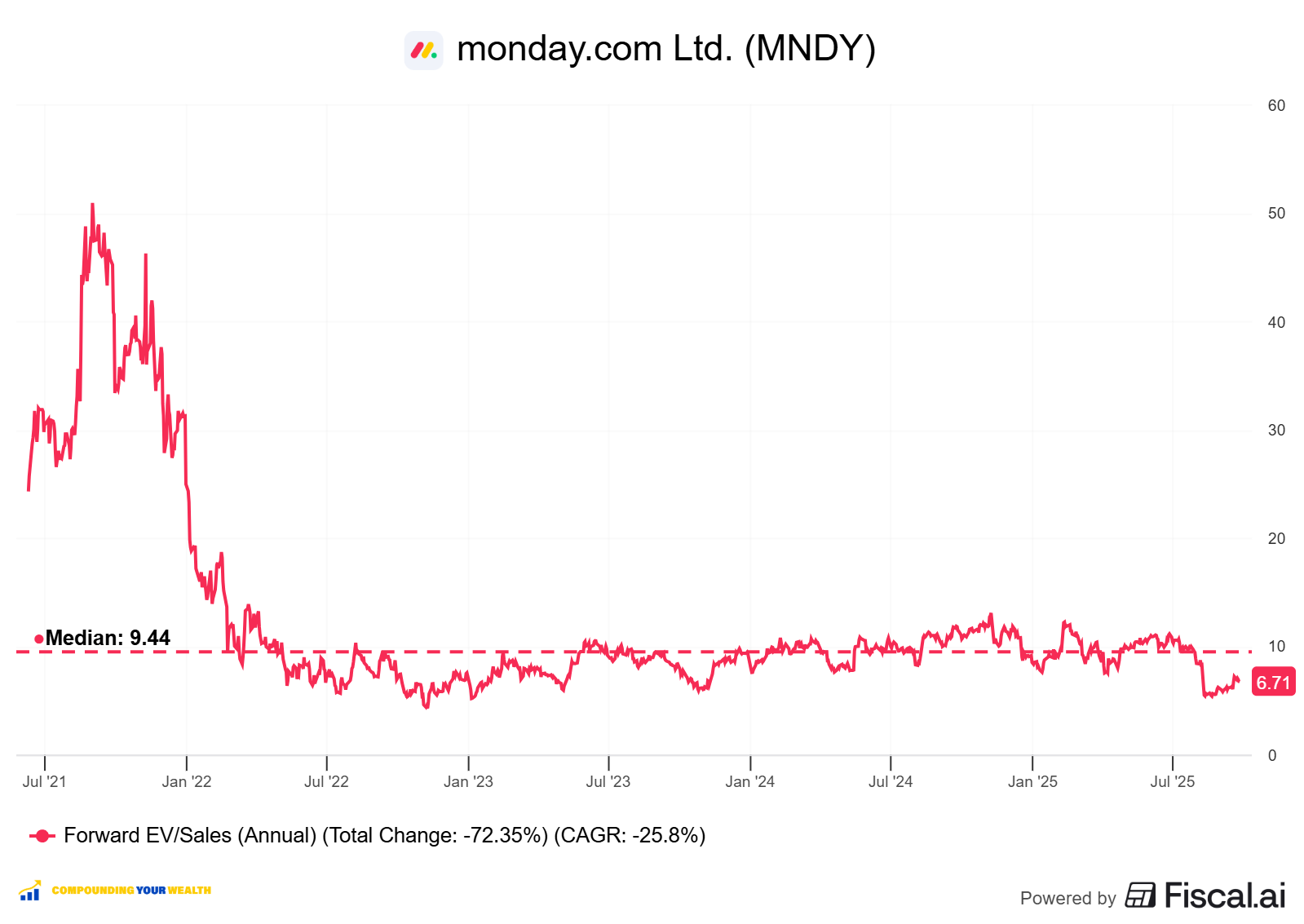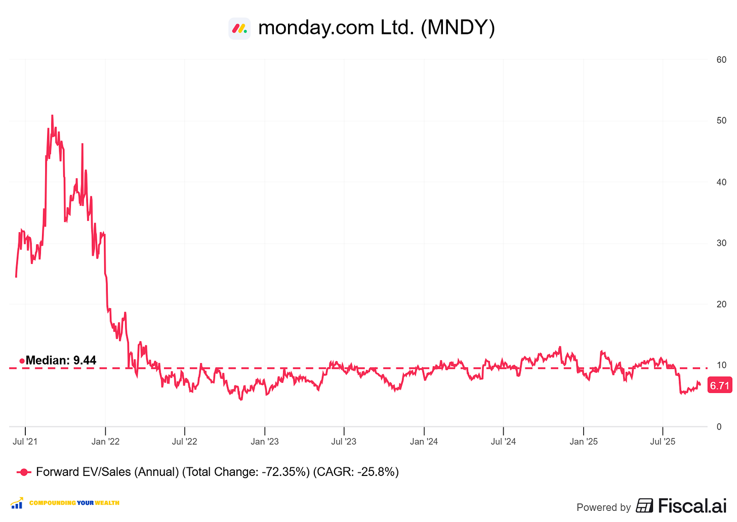 $MNDY is trading at a Forward EV/Sales multiple of 6.7, well below the median of 9.5 and close to historical lows.