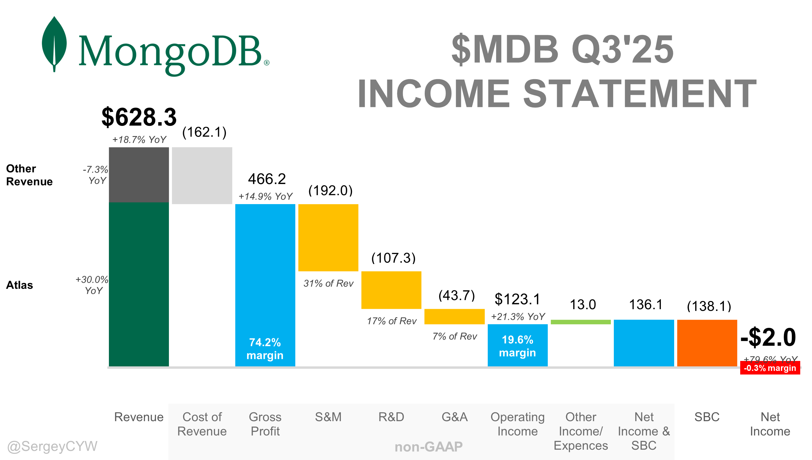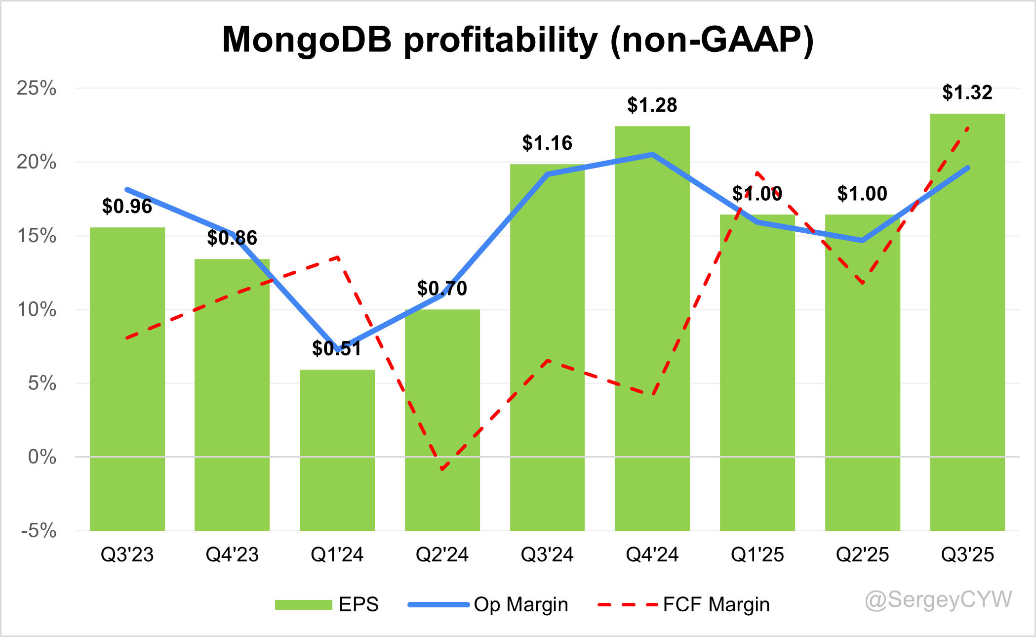 MongoDB delivered $628M in Q3 FY26 revenue, +19% YoY, above the high end of guidance. Non-GAAP operating income reached $123M for a 20% margin, up from 19% a year ago. Gross profit was $466M, with a 74% gross margin versus 77% last year due to higher cloud mix. Non-GAAP net income came in at $115M or $1.32 per diluted share on 86.9M shares. Operating cash flow climbed to $144M and free cash flow to $140M, up from $37M and $35M a year earlier. Total cash and investments ended the quarter at $2.3B.