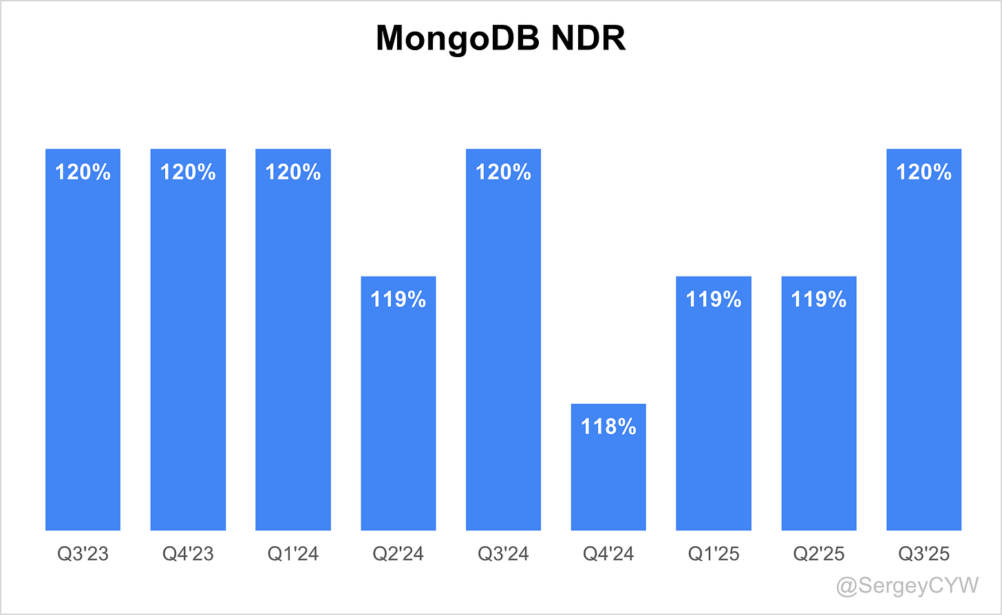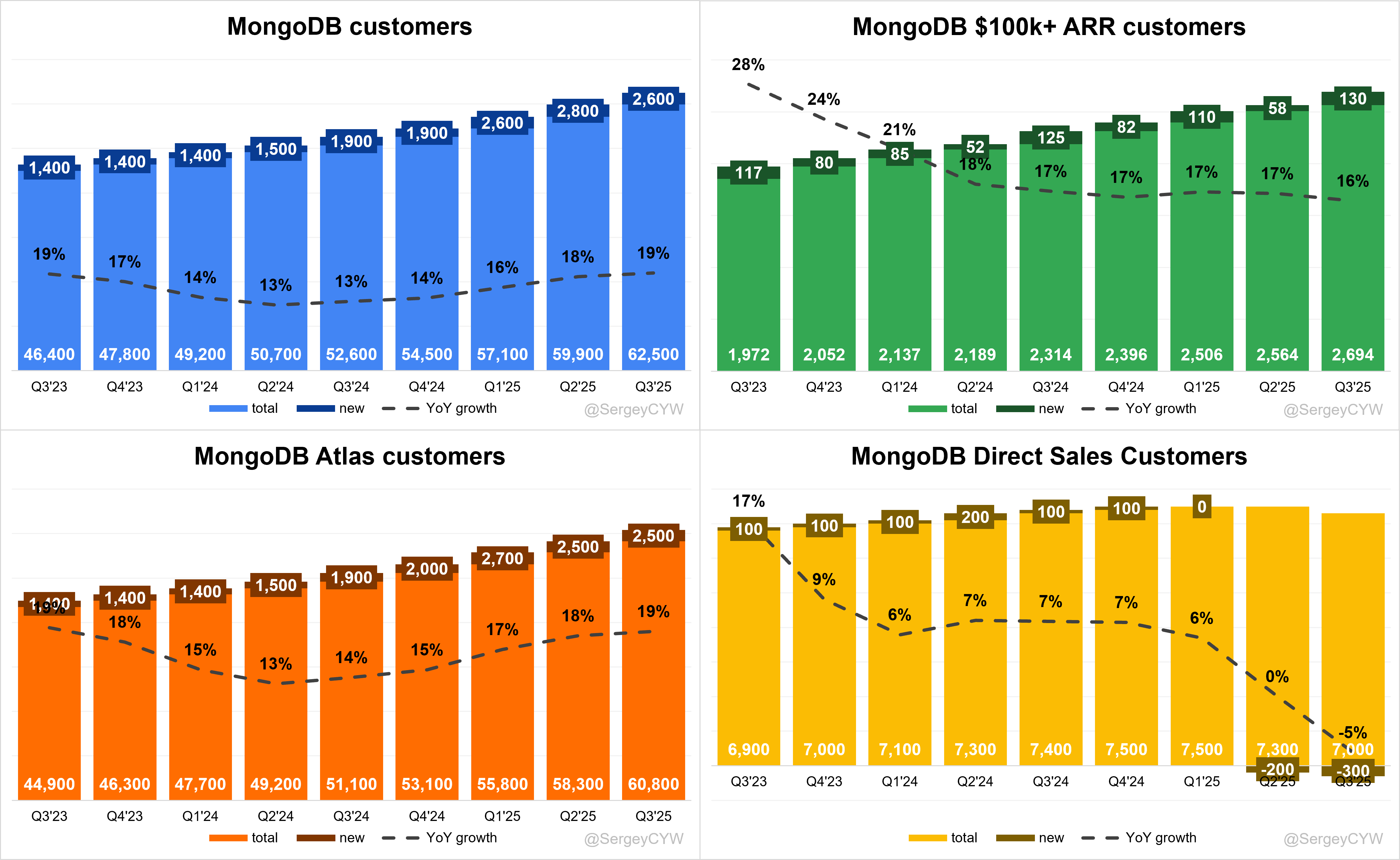 Atlas revenue grew 30% YoY and expanded to 75% of total revenue, up from 74% last quarter and 68% a year ago. Consumption trends remained stable with strength in large U.S. accounts and broad EMEA adoption. Net ARR expansion improved to 120%, while customers surpassed 62,500, growing by 2,600 sequentially and 8,000 year to date. Atlas customers exceeded 60,800 versus ~51,100 last year. Customers generating at least $100K ARR rose to 2,694, a 16% YoY increase. Releases of MongoDB 8.0 and 8.2 improved price-performance and reduced onboarding friction, accelerating self-serve adoption. Q4 Atlas growth is guided to 27% YoY, with holiday seasonality noted as the main variability factor.
