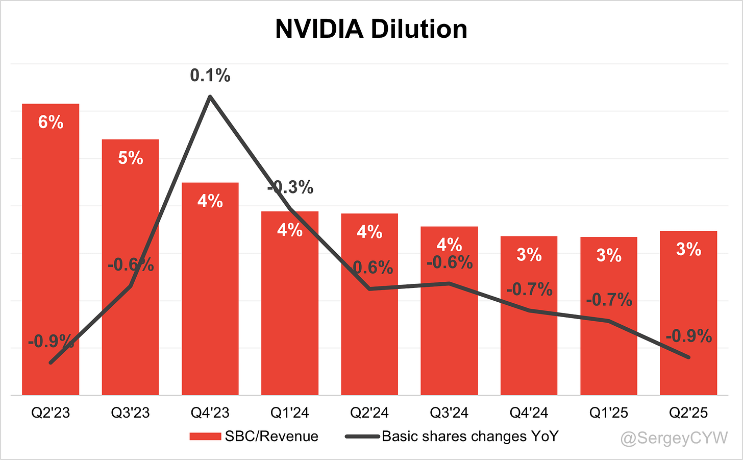 $NVDA Shareholder Dilution: Nvidia’s stock-based compensation (SBC) expenses declined in the last quarter, reaching 3% of revenue.