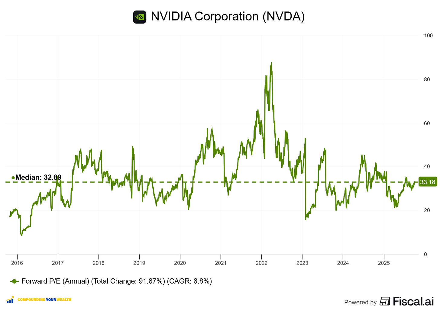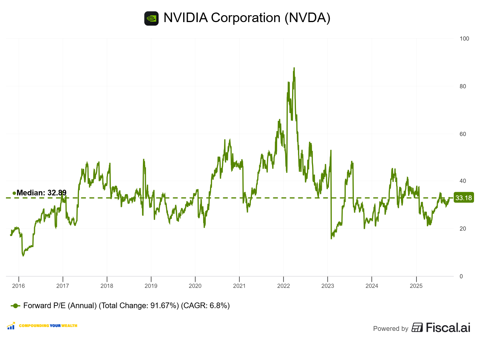$NVDA Nvidia is currently trading at a Forward P/E of 33.2, roughly in line with the median of 32.9, supported by 55.6% YoY revenue growth in the last quarter. This forward P/E equals 0.6x the anticipated revenue growth rate. At the start of 2025, the multiple dipped as low as 22.