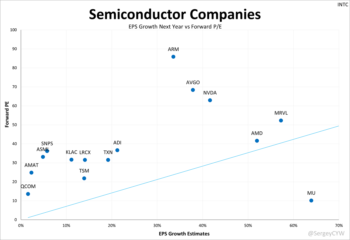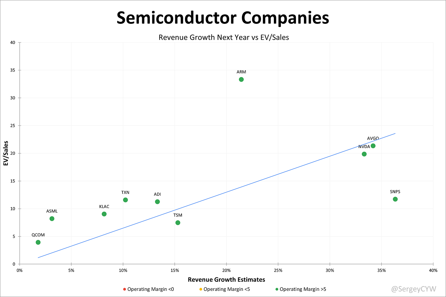 Analysts forecast +61.1% revenue growth for $NVDA in 2025 and +33.3% in 2026. Considering this projection, the valuation based on the EV/S multiple seems reasonable compared to other semiconductor companies.