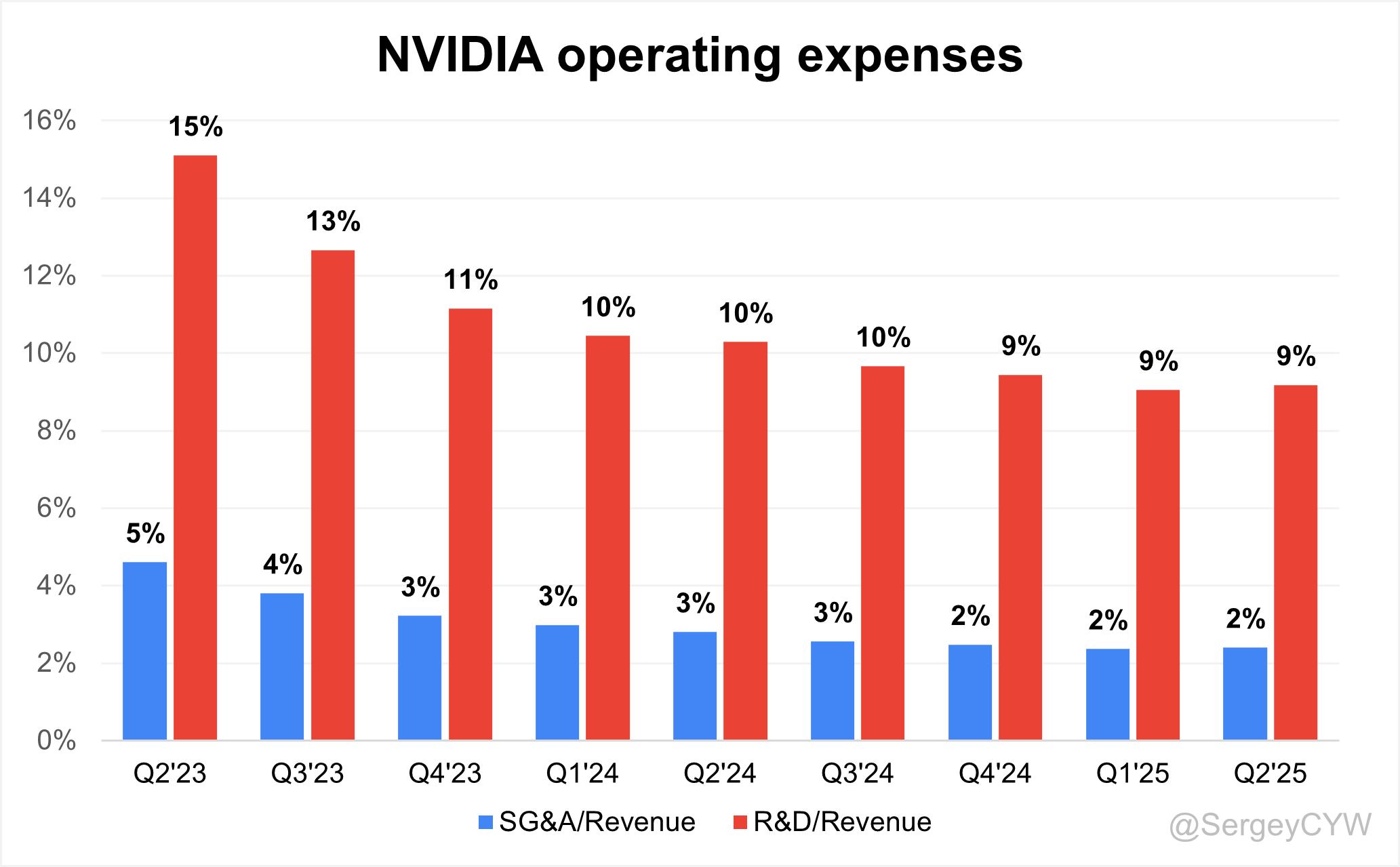 Operating expenses have gradually decreased. Notably, $NVDA Nvidia spends more on R&D than on S&M and G&A combined, enabling the company to continuously improve its products and expand market share. R&D expenses remain high at 9% of revenue, while SG&A expenses have declined to 2%.
