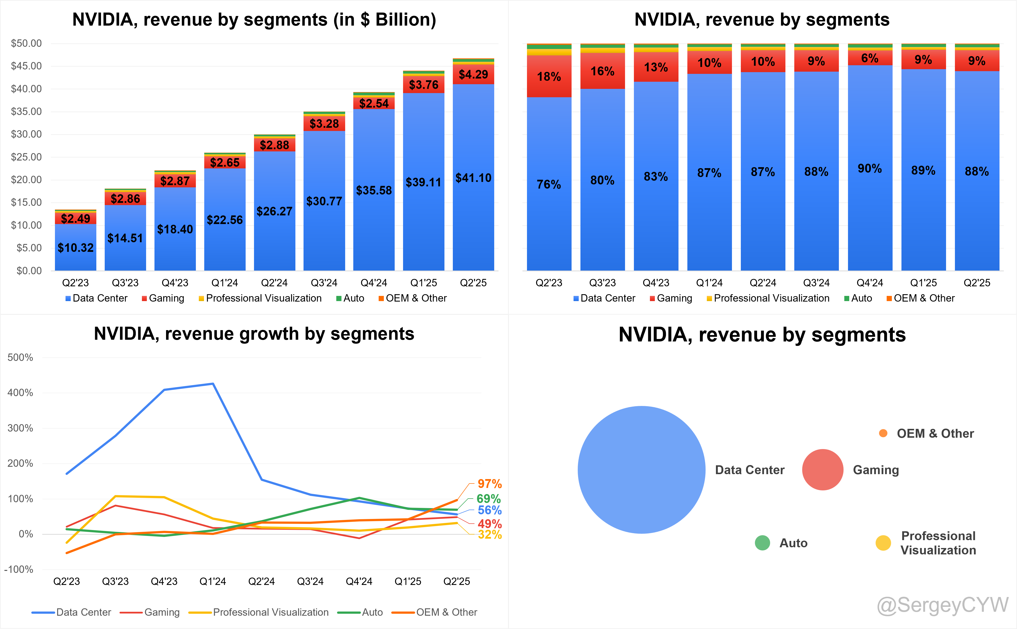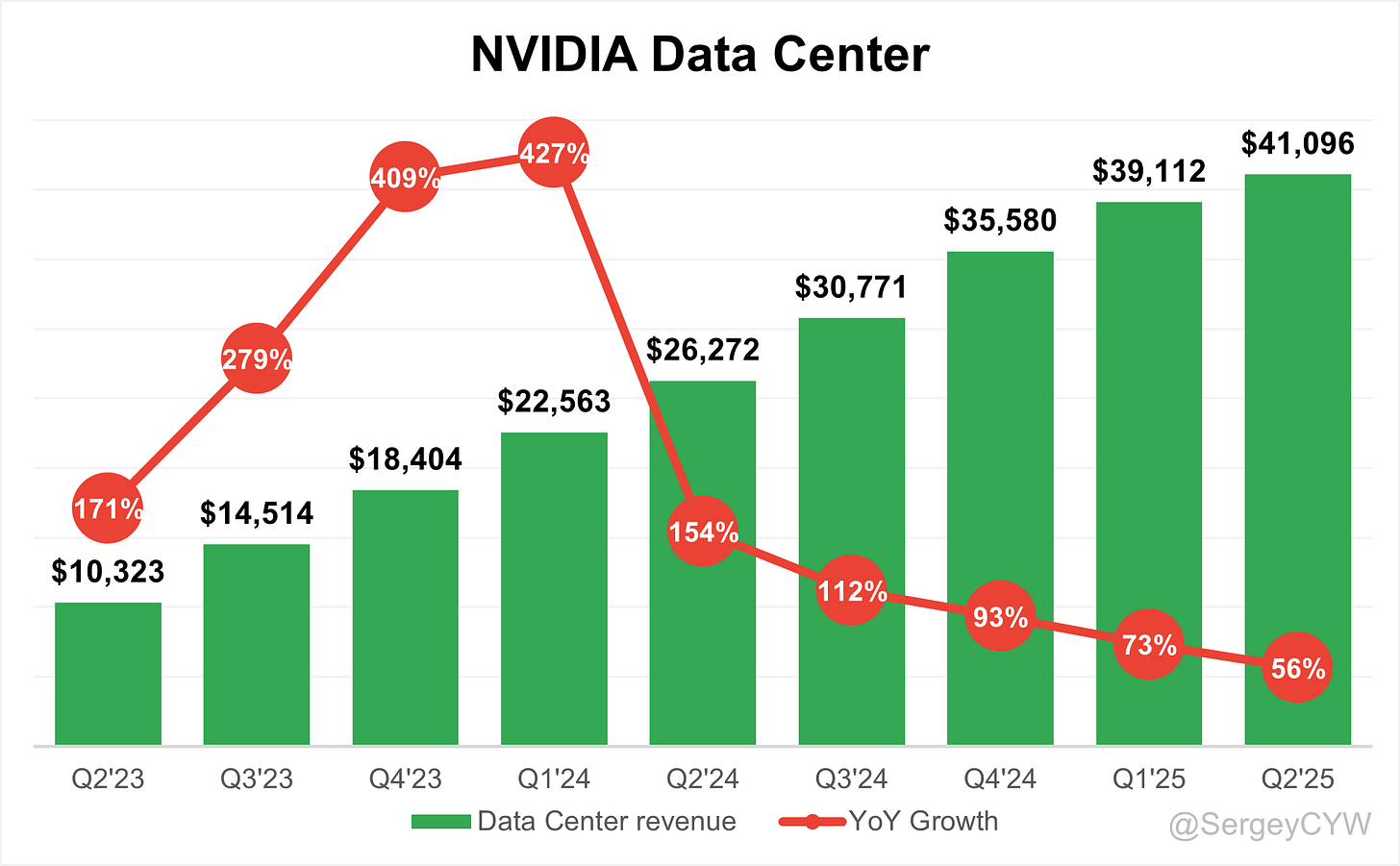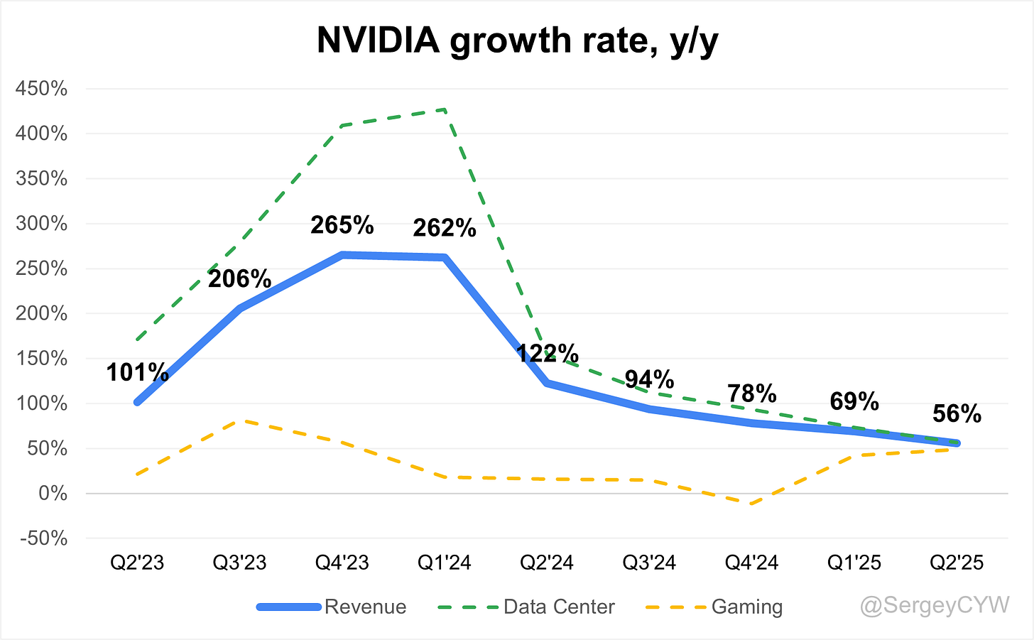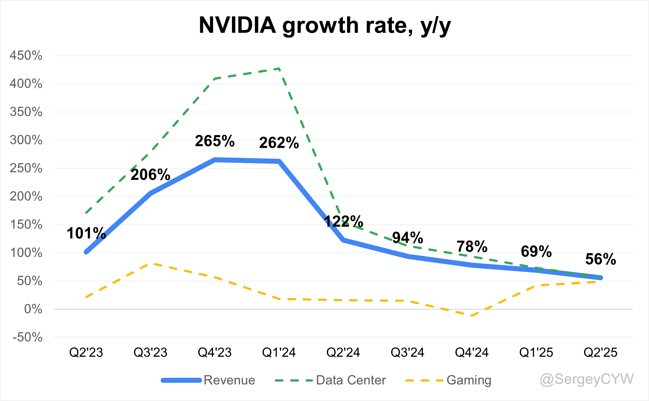 $NVDA Nvidia’s revenue growth was an incredible 262% in Q1 2024 and decreased to an equally remarkable 55.6% in Q2 2025. The primary growth driver is the Data Center segment, whose revenue is outpacing overall revenue growth.