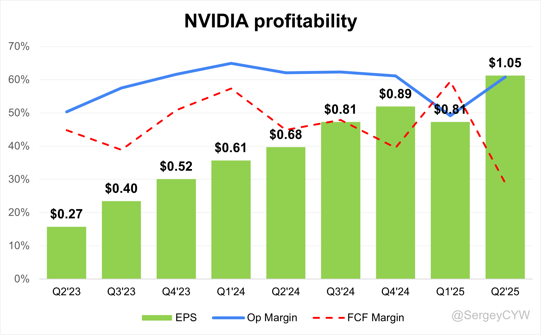 Revenue growth remains exceptionally strong at +55.6% YoY, with the Data Center segment up +56.4% YoY, outpacing total revenue and serving as the primary growth engine. Despite growth gradually decelerating, it remains at very high levels. Remarkably, if Nvidia beats its Q3 forecast by the same 3.9% margin as in Q2, growth would reach +59.9% YoY, signaling further acceleration.