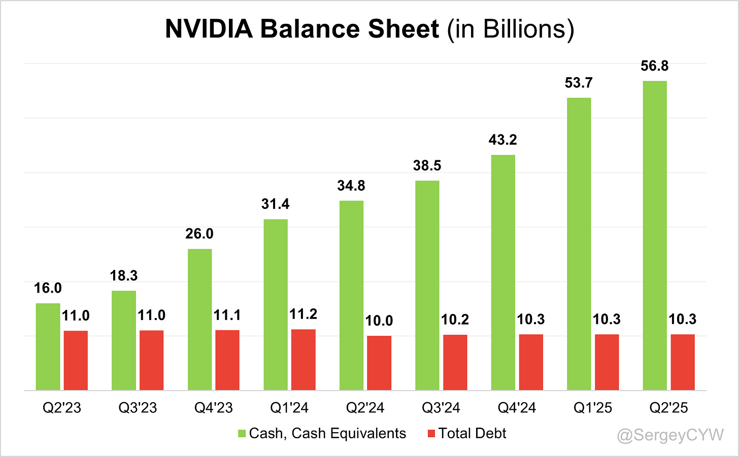 $NVDA Balance Sheet: Total debt stands at $10.3B, while Nvidia holds $56.8B in cash and cash equivalents, exceeding total debt and ensuring a healthy balance sheet.