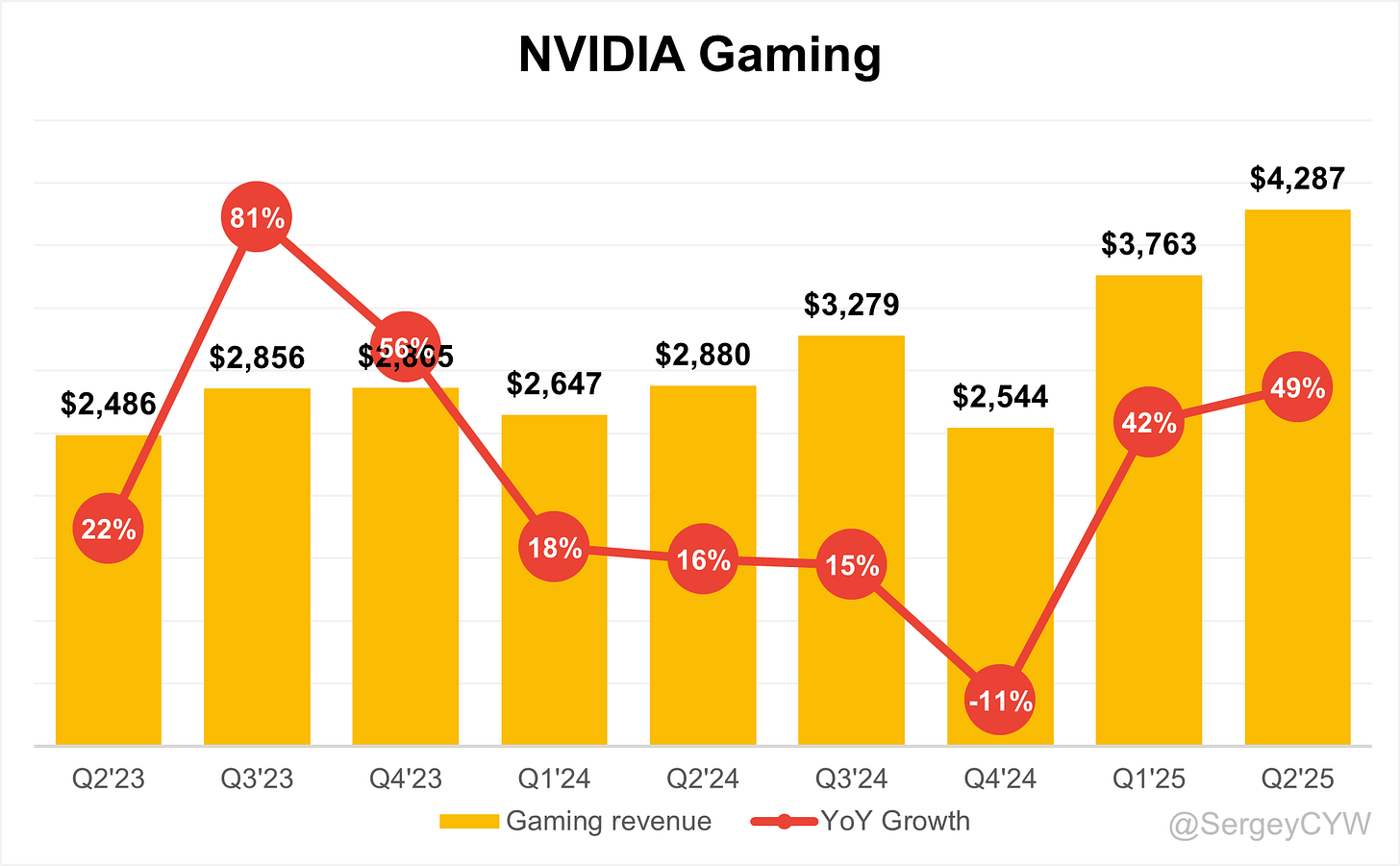 The second-largest contributor to $NVDA Nvidia’s overall revenue has been the Gaming segment, though its share has declined significantly from 18% two years ago to just 9%. In the most recent quarter, the segment reported a +49% YoY increase in revenue, accelerating from negative -11% growth in Q4 2024.