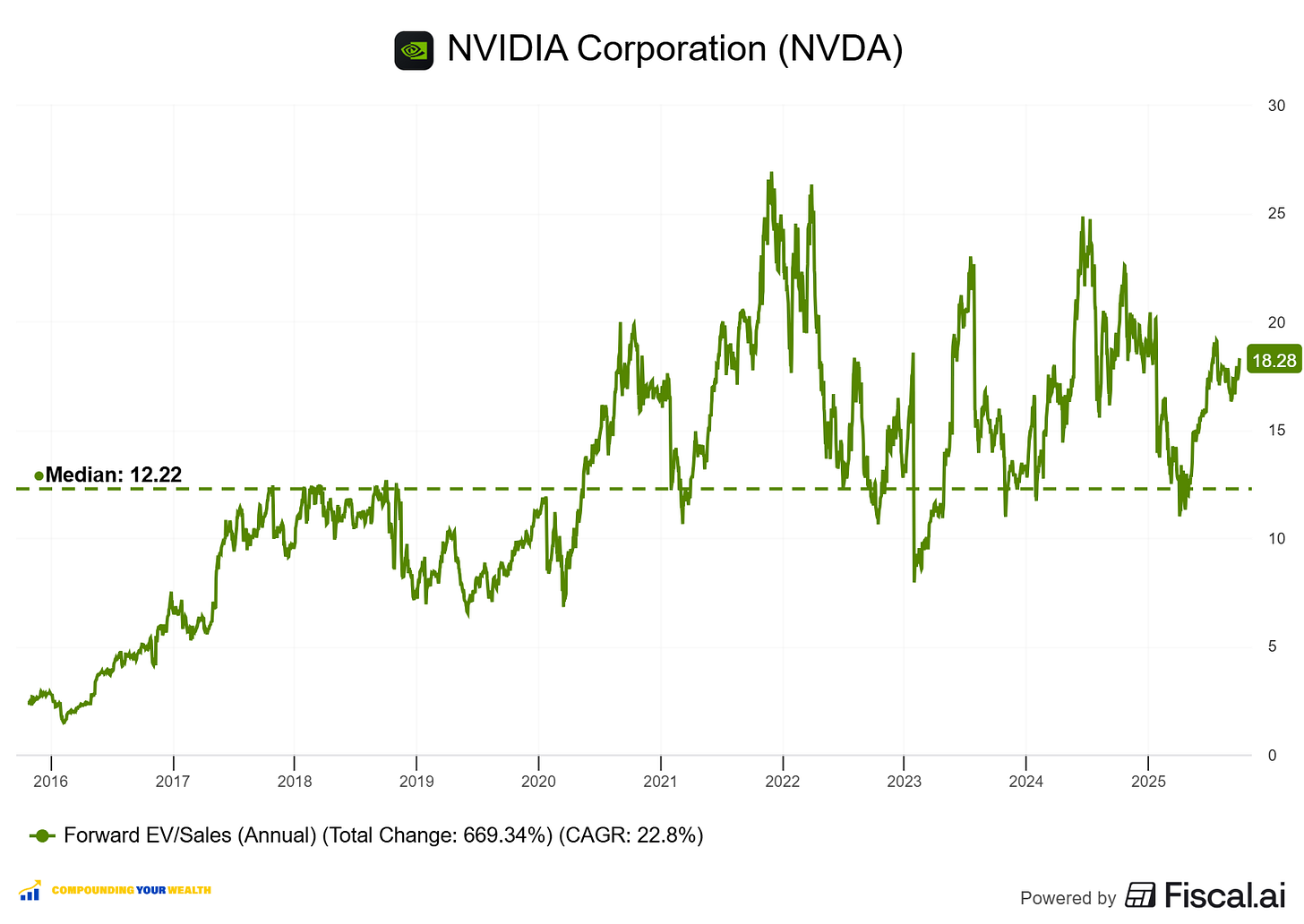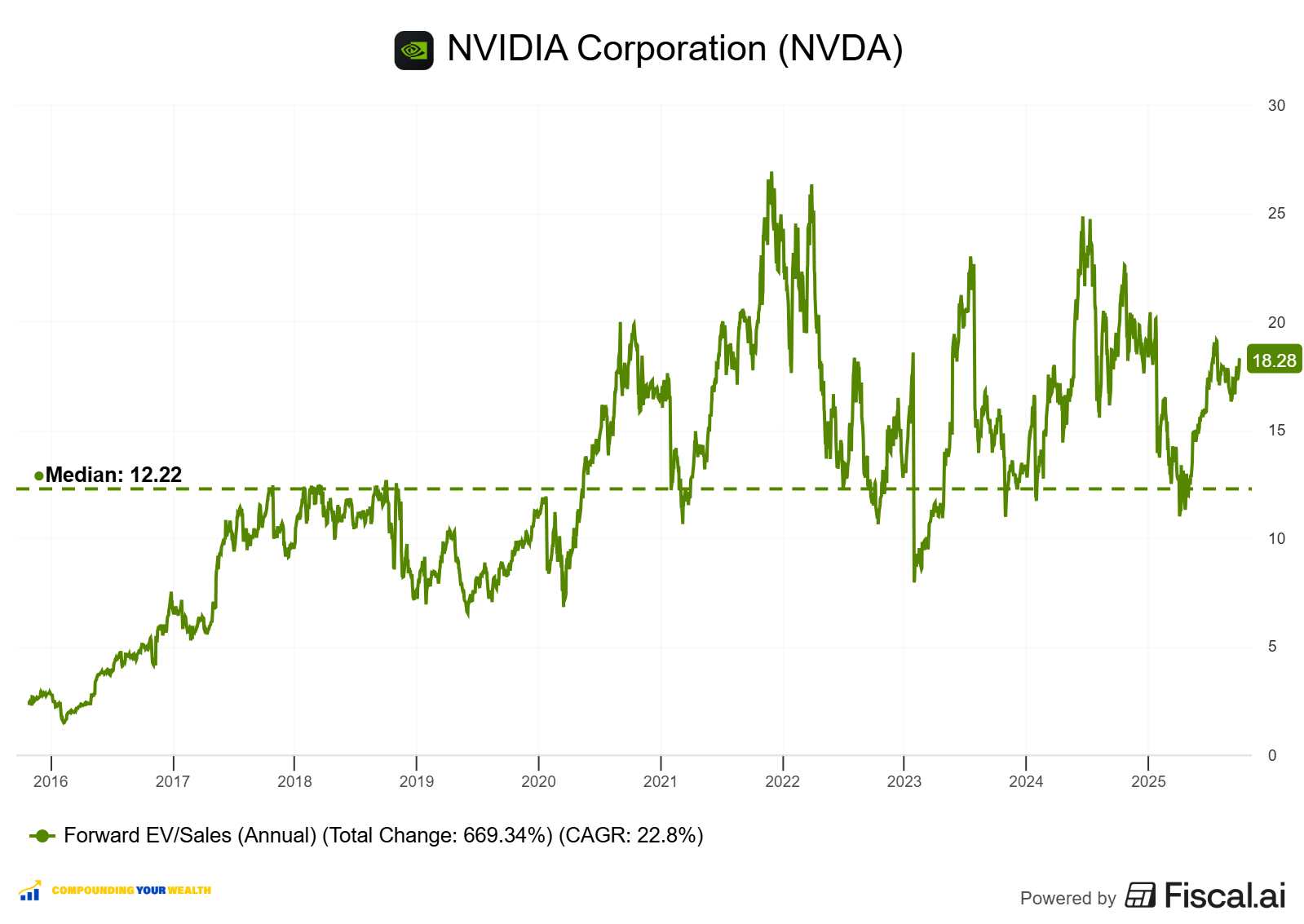 Looking at $NVDA’s valuation through Forward EV/Sales, it currently stands at 18.3, which is well above the median of 12.2. The 2024 peak was 25, and while today’s multiple is lower, it’s gradually moving back toward that high.