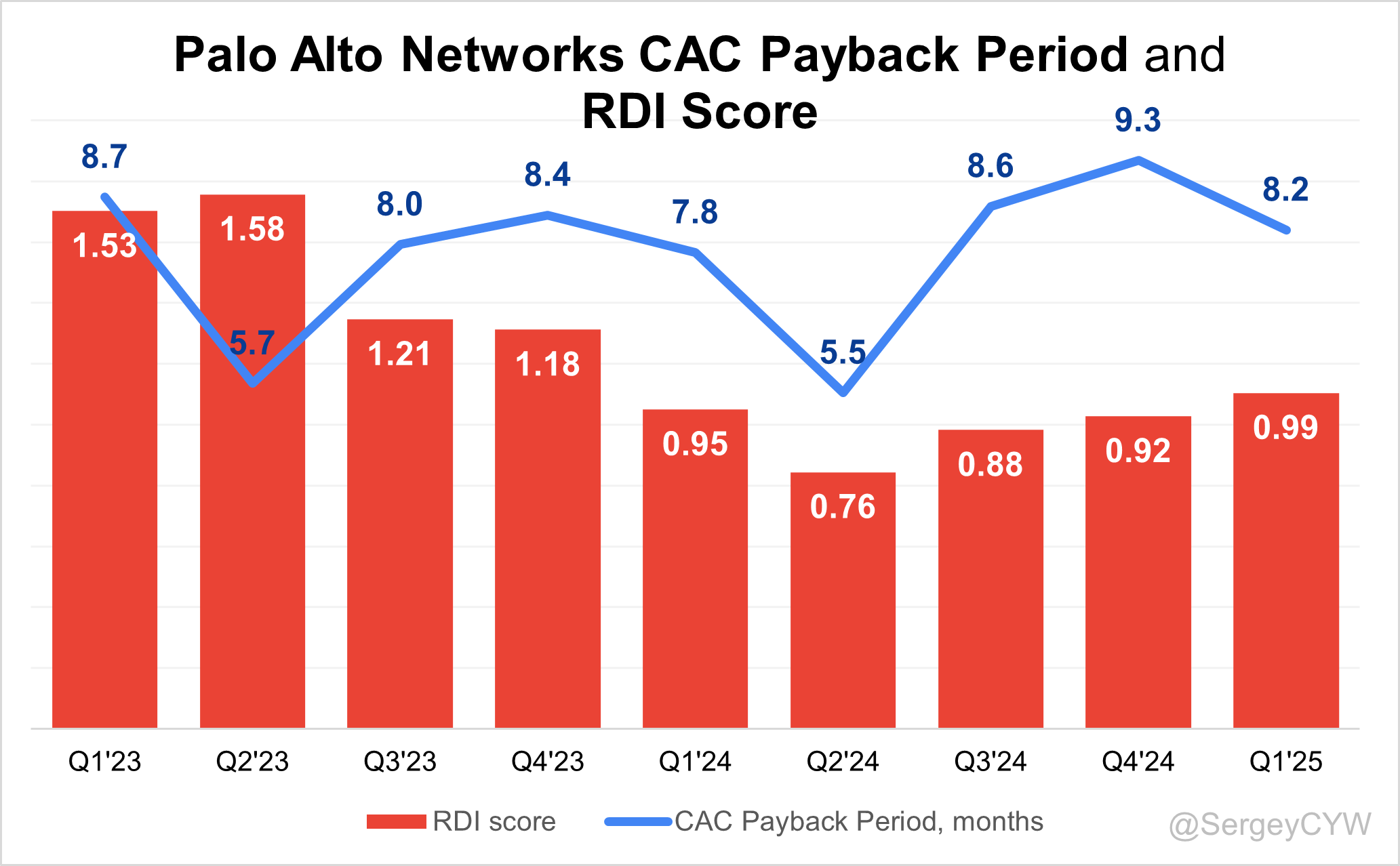 $PANW's return on S&M spending is 8.2. The CAC Payback Period has slightly improved compared to the previous quarter and remains better than the average for SaaS companies (the median among those I track is 26.9 months).
