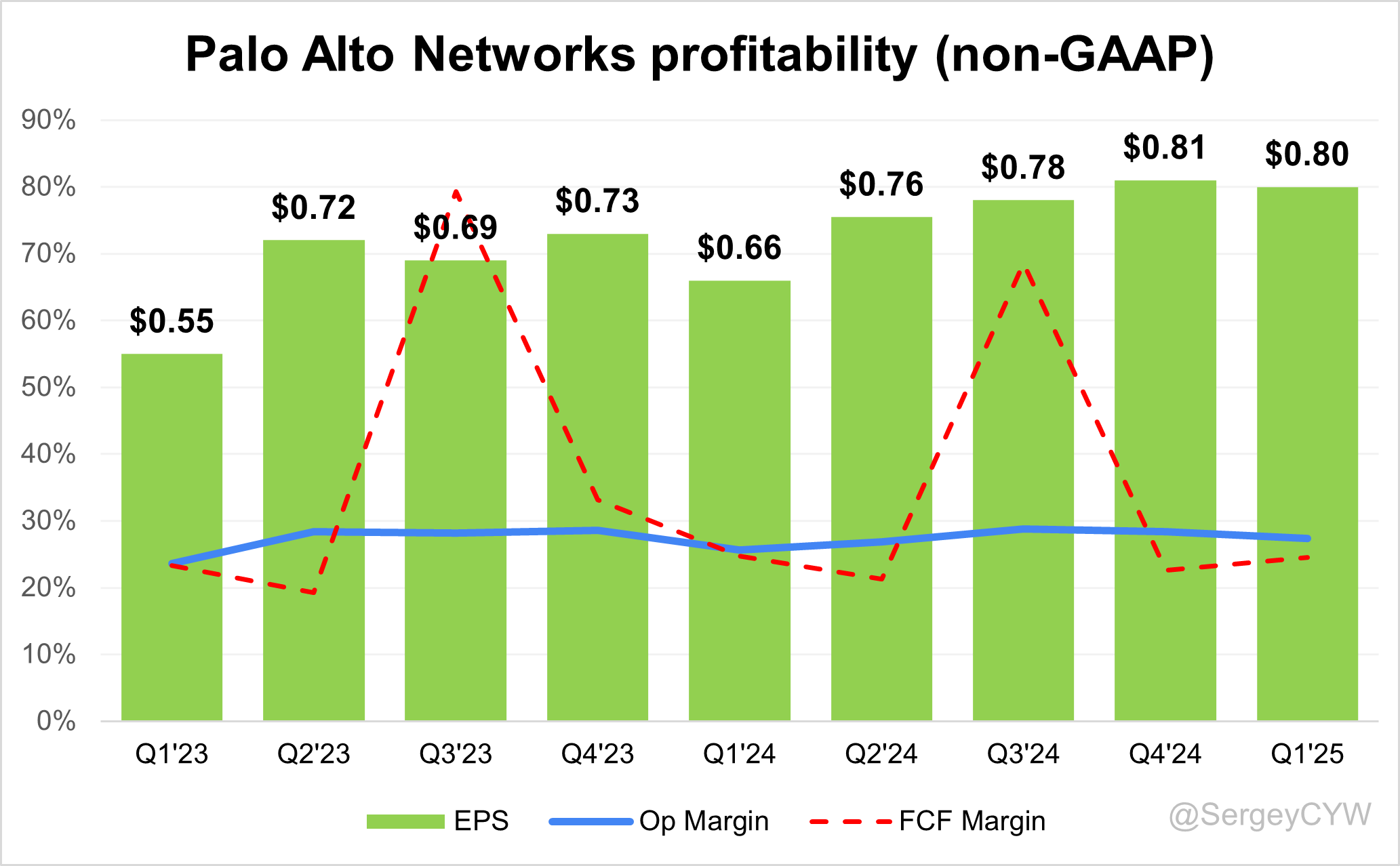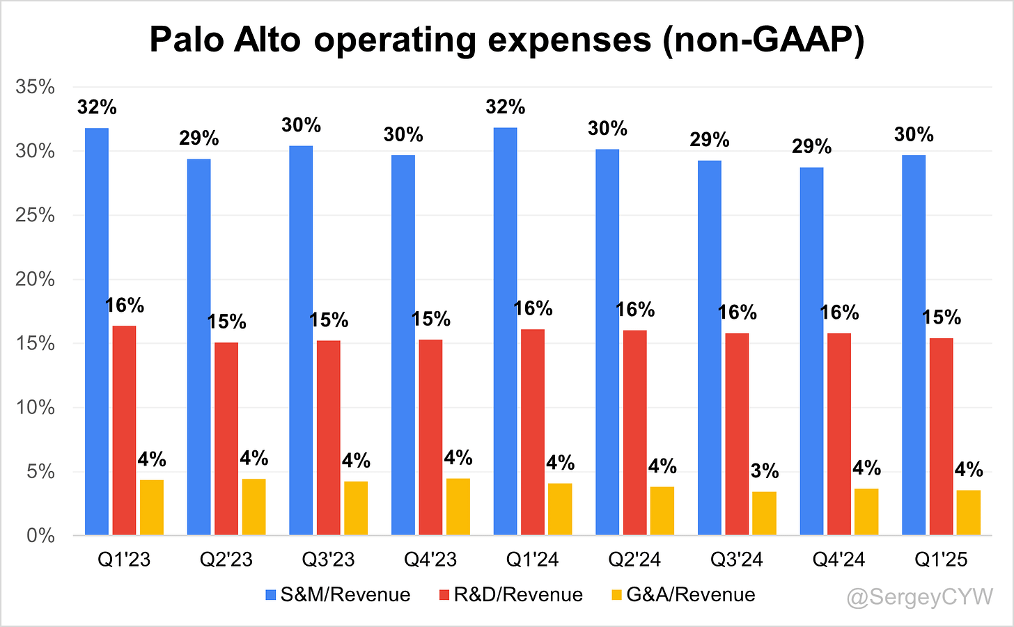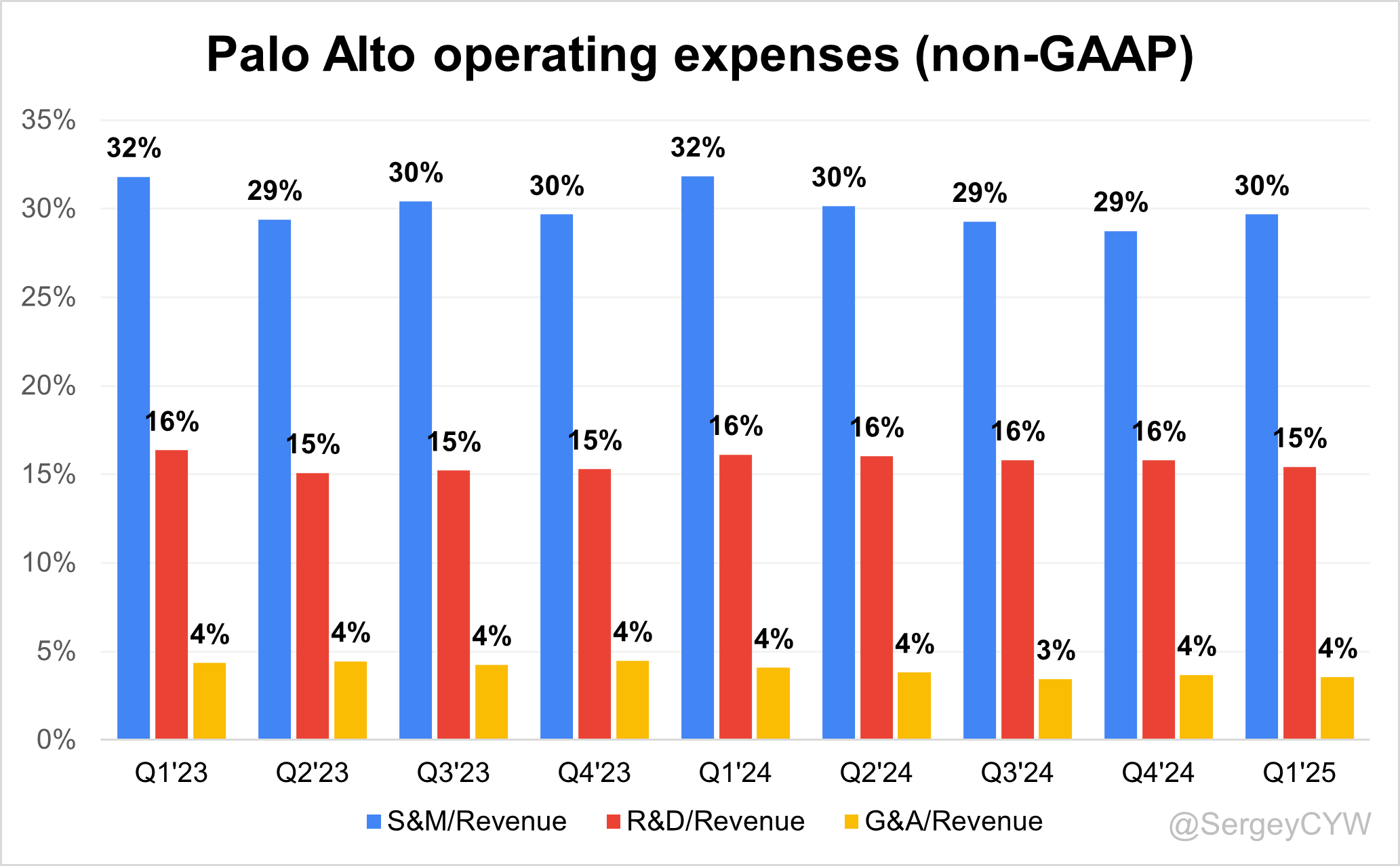 $PANW's non-GAAP operating expenses have decreased, primarily due to reduced Sales & Marketing (S&M) spending, which declined from 32% two years ago to 30%.