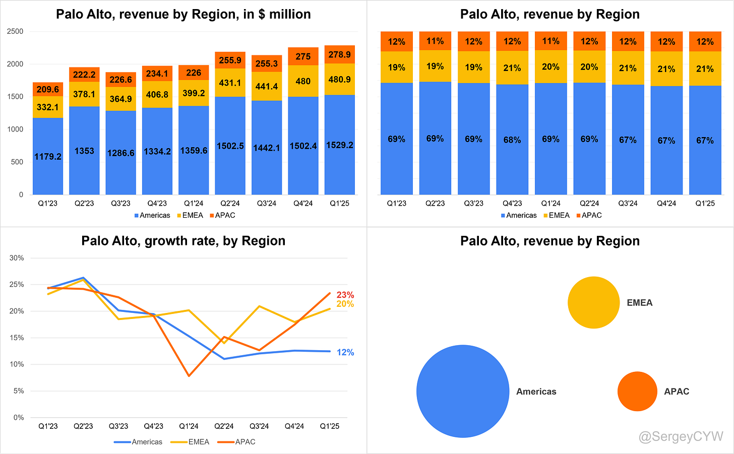 The Americas region accounts for 67% of total revenue, making it $PANW Palo Alto’s largest market, with revenue growing +12% YoY in Q1.