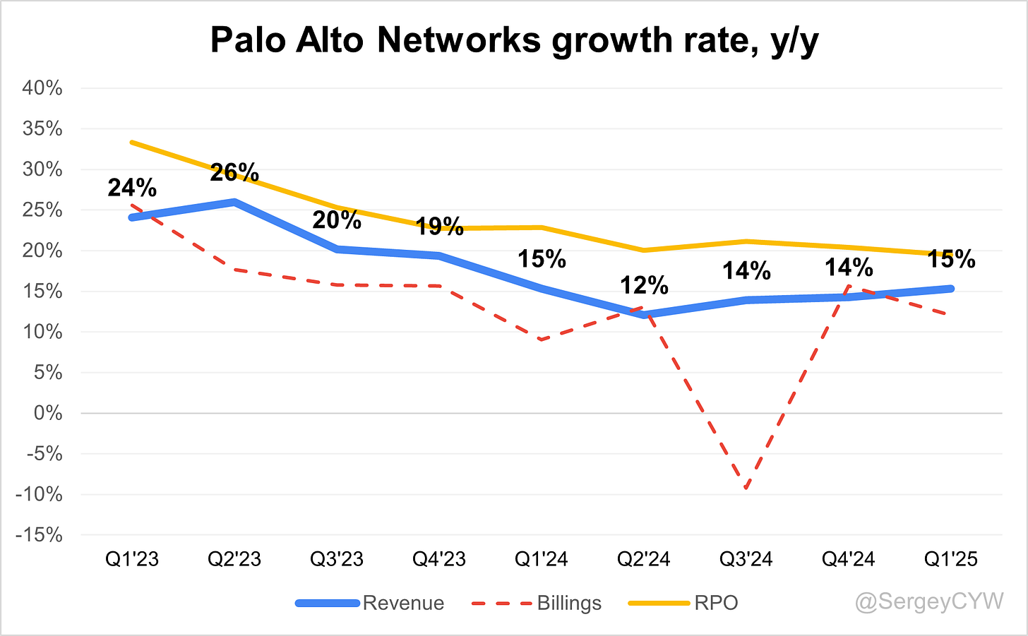 $PANW revenue growth is picking up—Q1 landed at +13.3% YoY. If the company beats next quarter’s guidance by its recent average (+0.4%), we could see Q1 growth hit 15.1%—a real sign of revenue stabilization.