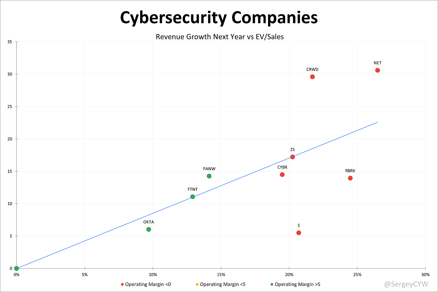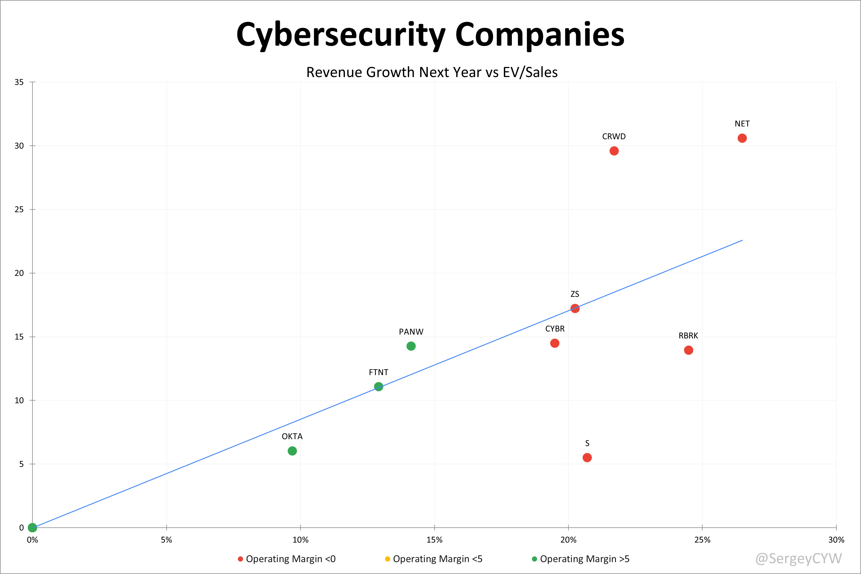 Analysts' revenue growth forecast for $PANW in 2025 is +16.7%, and +14.0% for 2026. Considering this forecast, the valuation based on the EV/Sales multiple appears fair when compared to other companies in the cybersecurity sector.