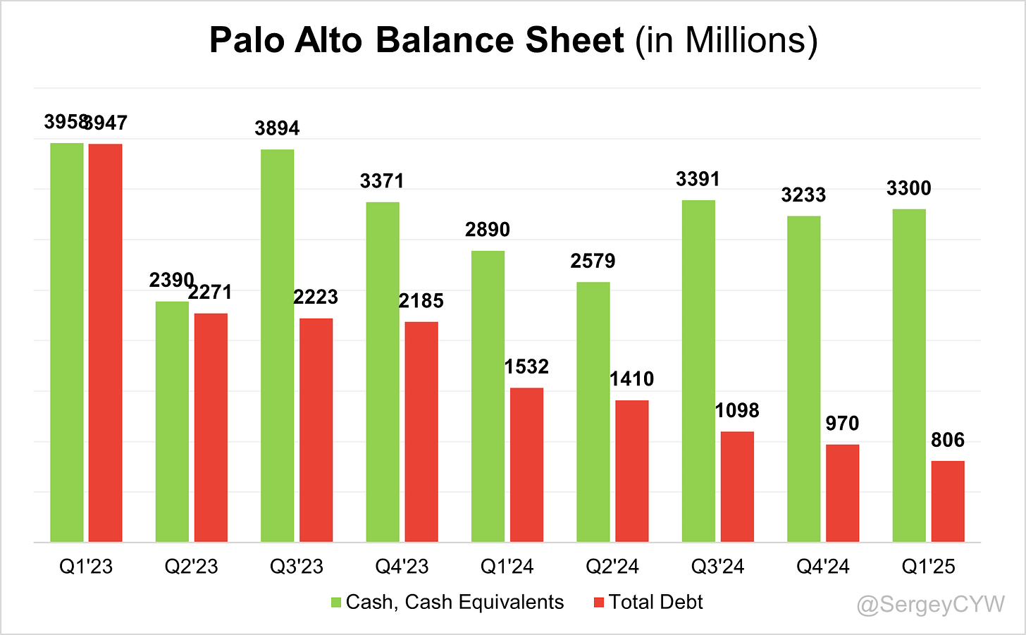 $PANW Balance Sheet: Total debt stands at $806M, while Palo Alto holds $3,300M in cash and cash equivalents, exceeding total debt and ensuring a healthy balance sheet.