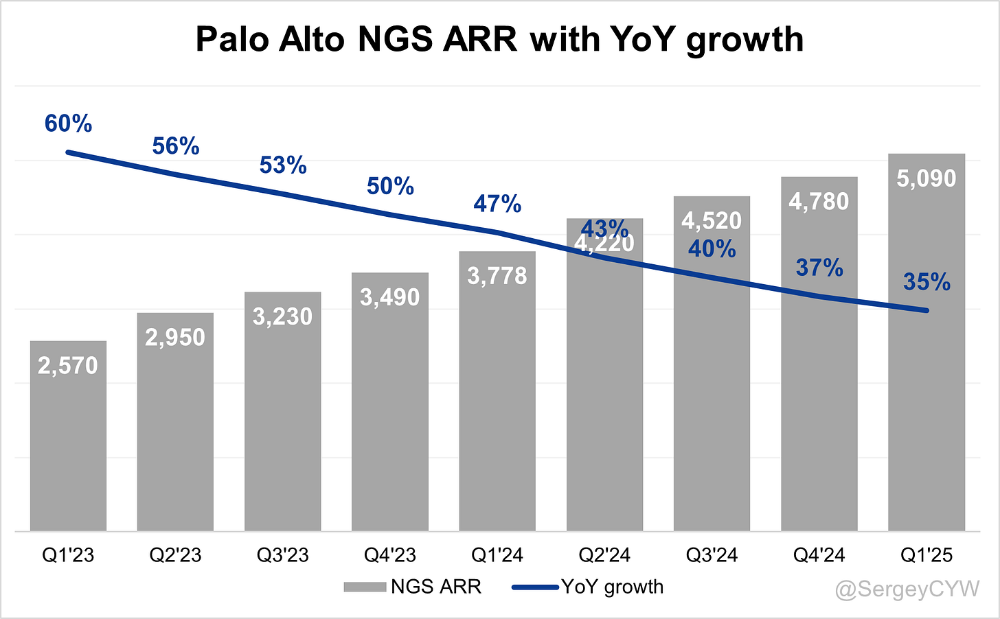 Palo Alto $PANW NGS ARR growth is slowing, reaching +35% YoY in Q1, which is above the company’s revenue growth.
