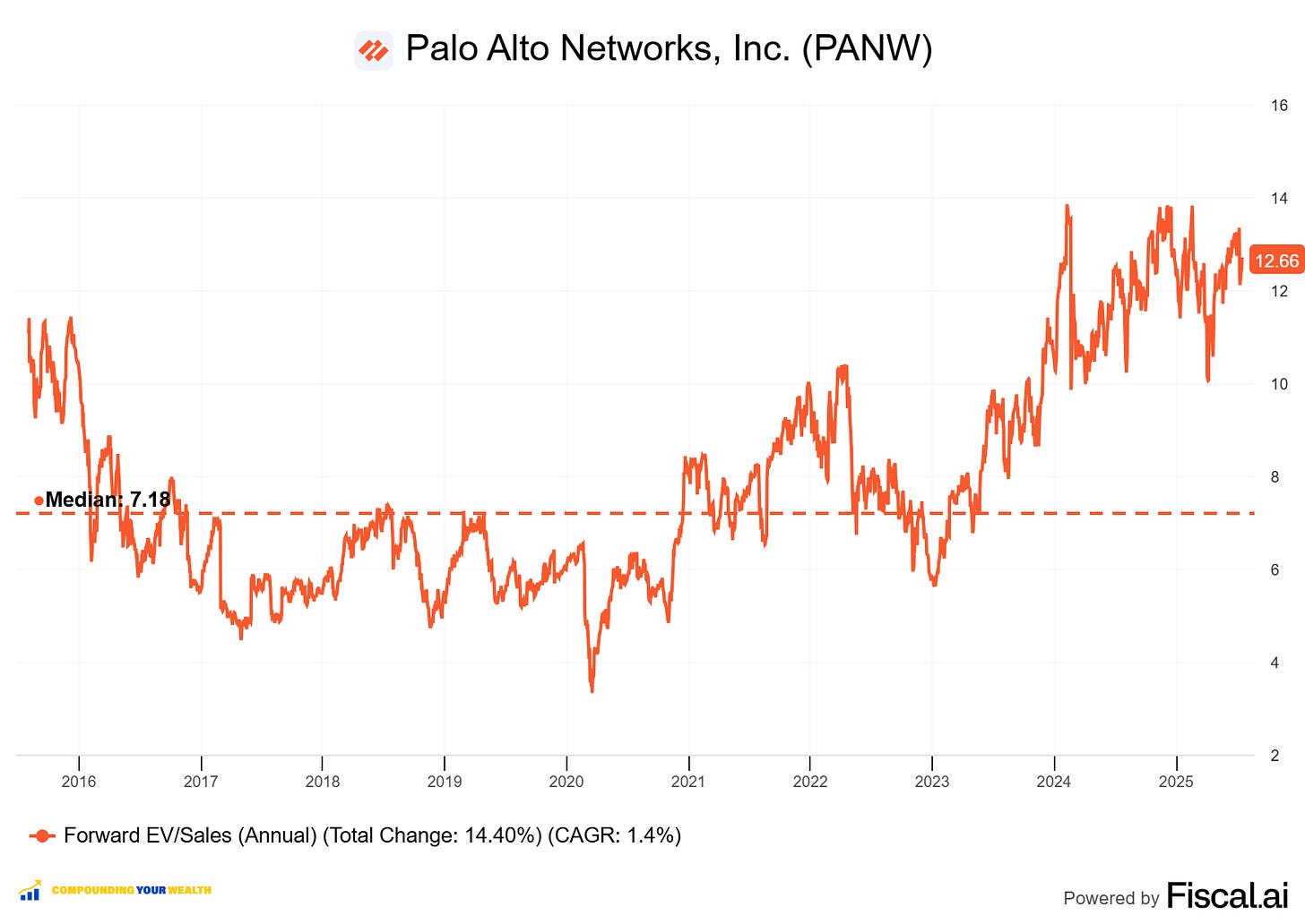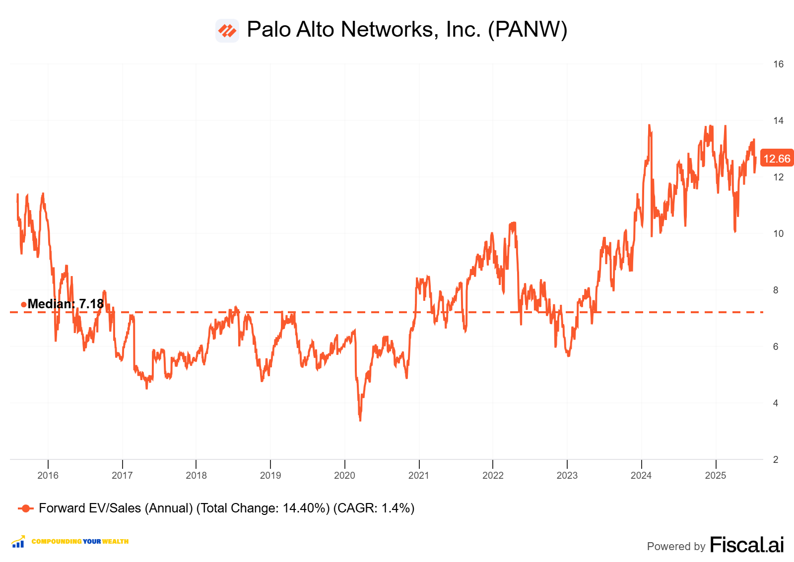 $PANW Palo Alto is trading at a Forward EV/Sales multiple of 12.6, above the median of 7.2. The company's Forward EV/Sales multiple is near its historical highs.