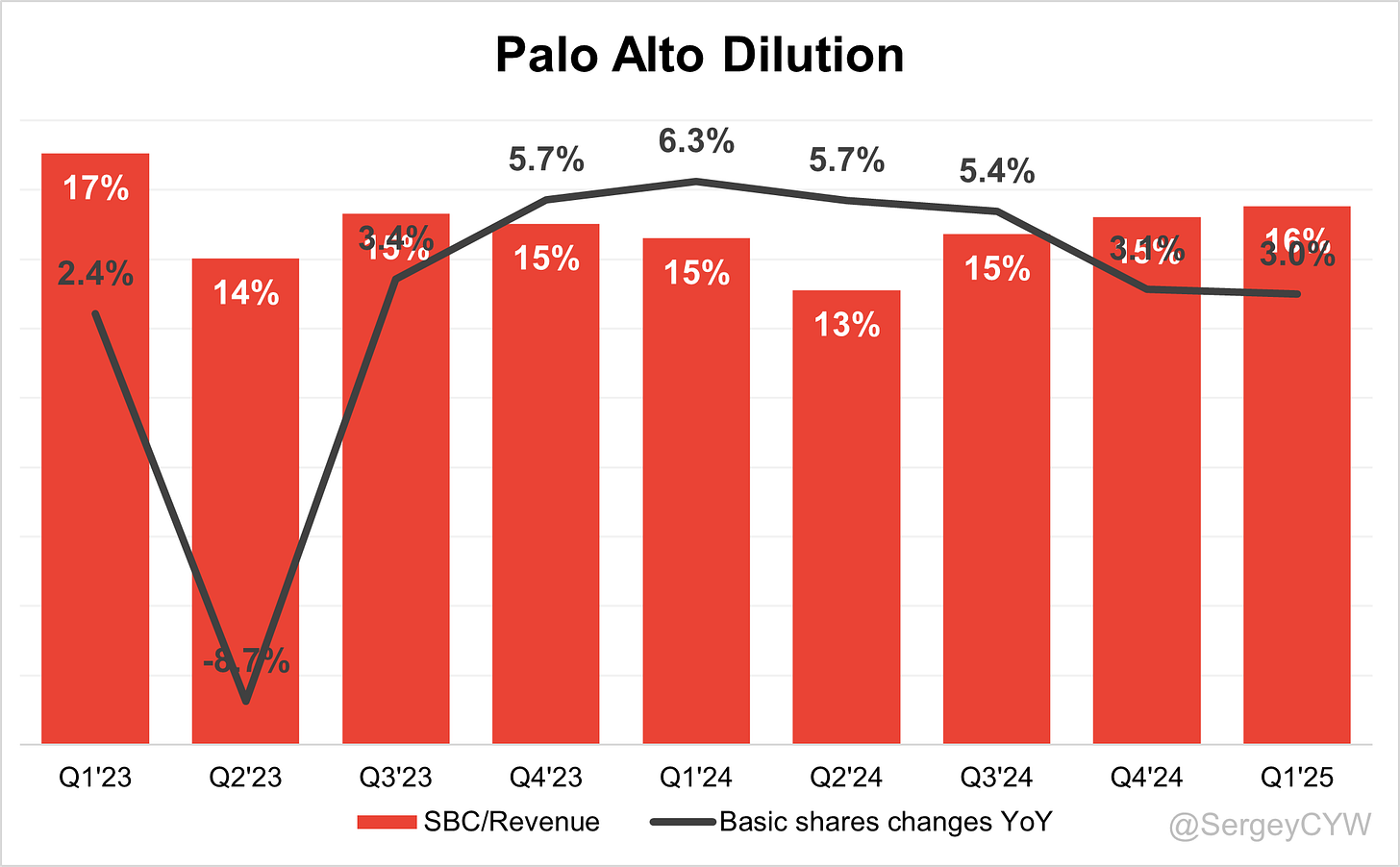 $PANW Shareholder Dilution: Palo Alto's stock-based compensation (SBC) expenses have slightly increased over the past two quarters, reaching 16% of revenue in the last quarter, which is relatively low for SaaS companies.