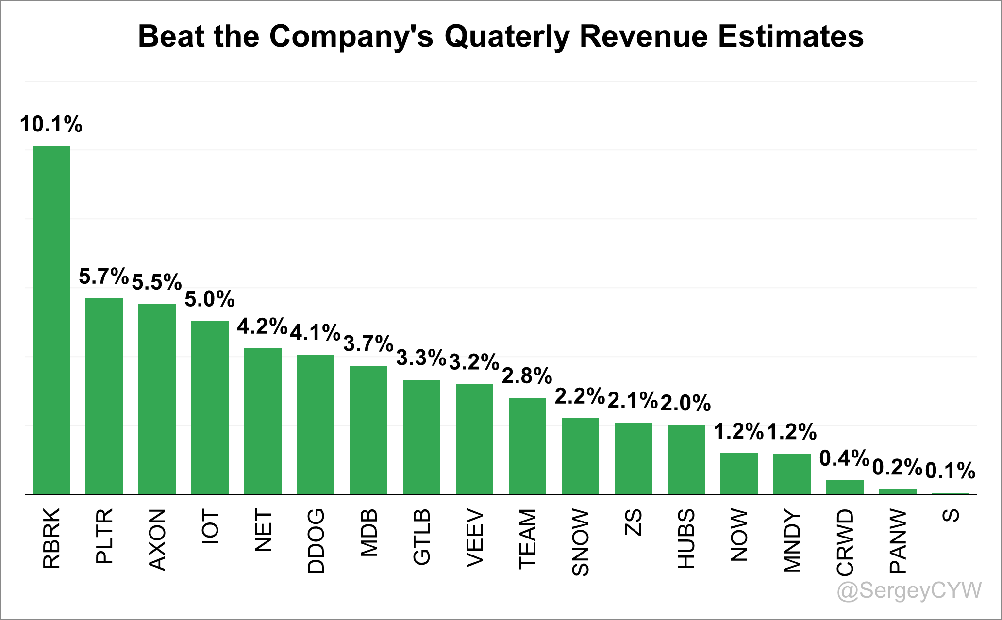 The quarter began with $RBRK delivered the largest revenue beat at 10.1%. Next were $PLTR (5.7%), $AXON (5.5%), and $IOT (5.0%).