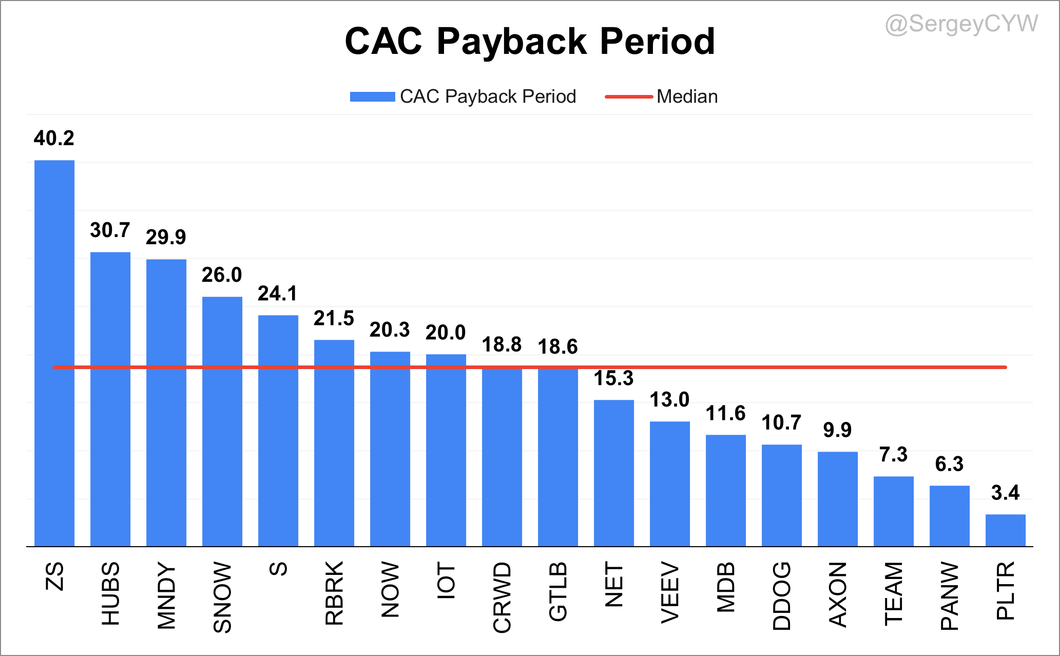 On the other hand, the best performers were $PLTR with a payback period of 3.4 months, $PANW at 6.3 months, $TEAM at 7.3 months.