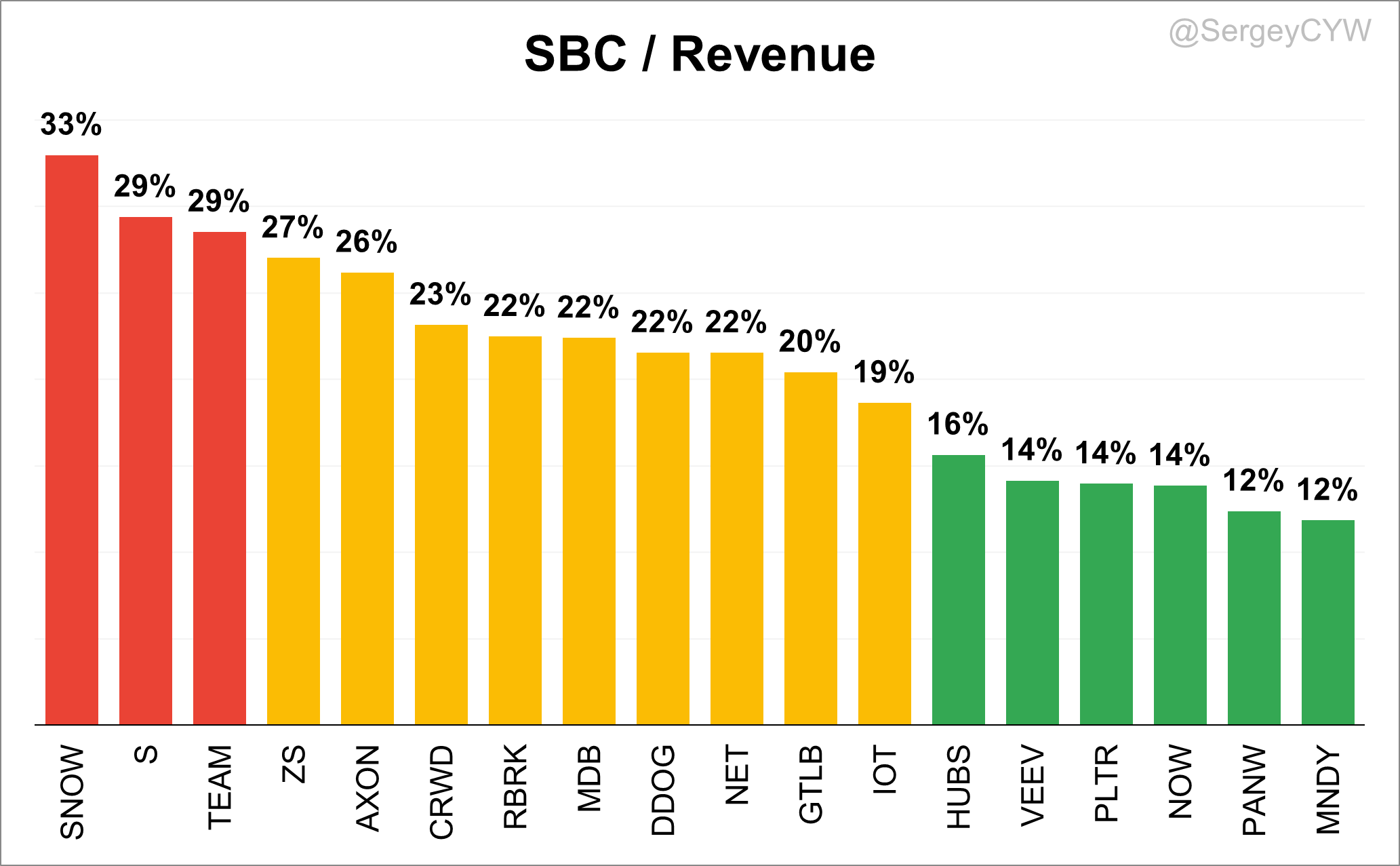 Next are $NET, $ZS, $CRWD, $MDB, $GTLB, $DDOG, and $AXON, with elevated SBC levels above 20%.