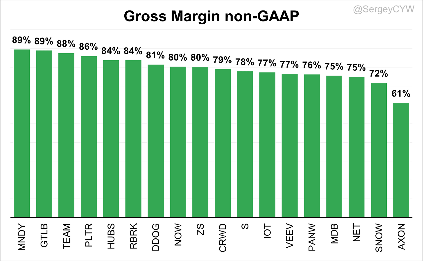 Next, let's discuss margins, starting with Gross Margin non-GAAP. For $AXON, the Gross Margin is 61%, but specifically for Software & Services, it’s 73%. The highest Gross Margins are seen at $MNDY and $GTLB 89%.