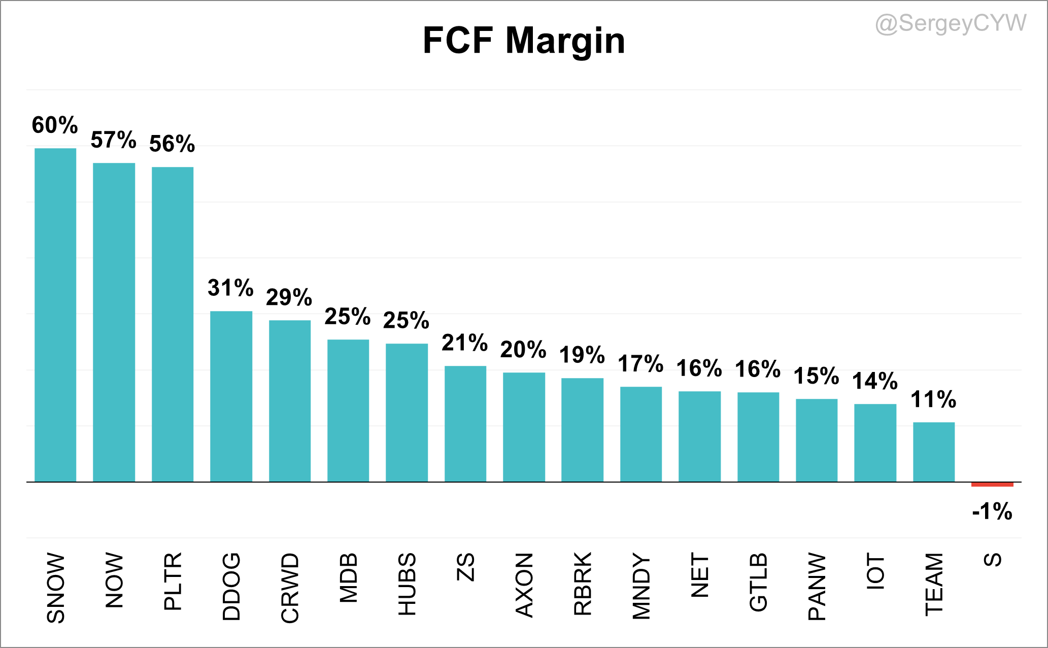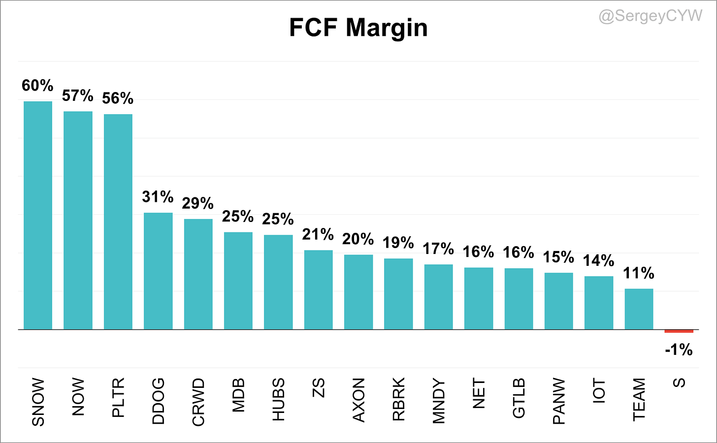For Q4 2025, the highest Free Cash Flow (FCF) margin was reported by $SNOW at 60%, followed by $NOW at 57%, and $PLTR at 56%.
