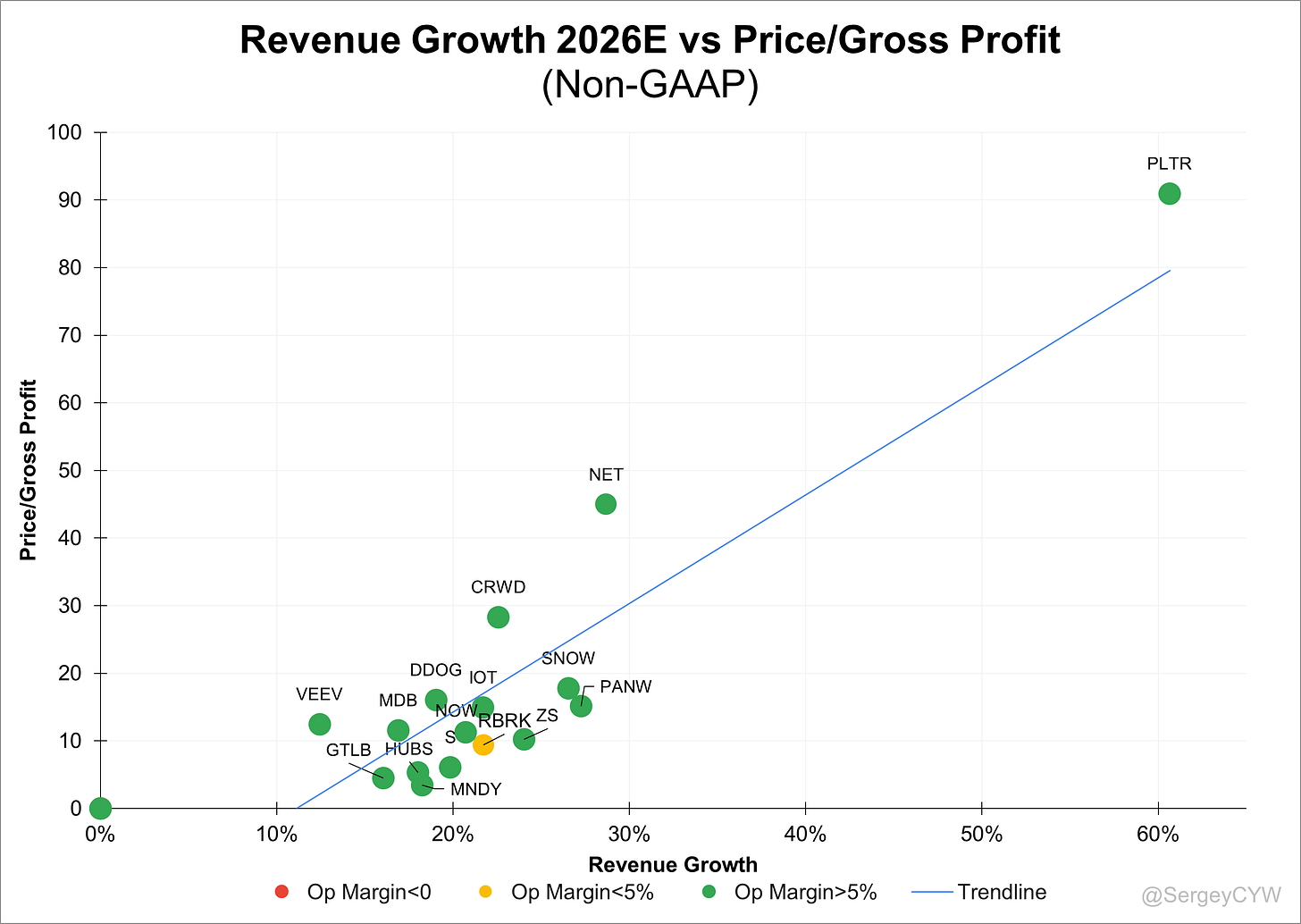 Finally, let’s examine company valuations by analyzing the Price/Gross Profit (Non-GAAP) multiple relative to projected revenue growth over FY 2025.