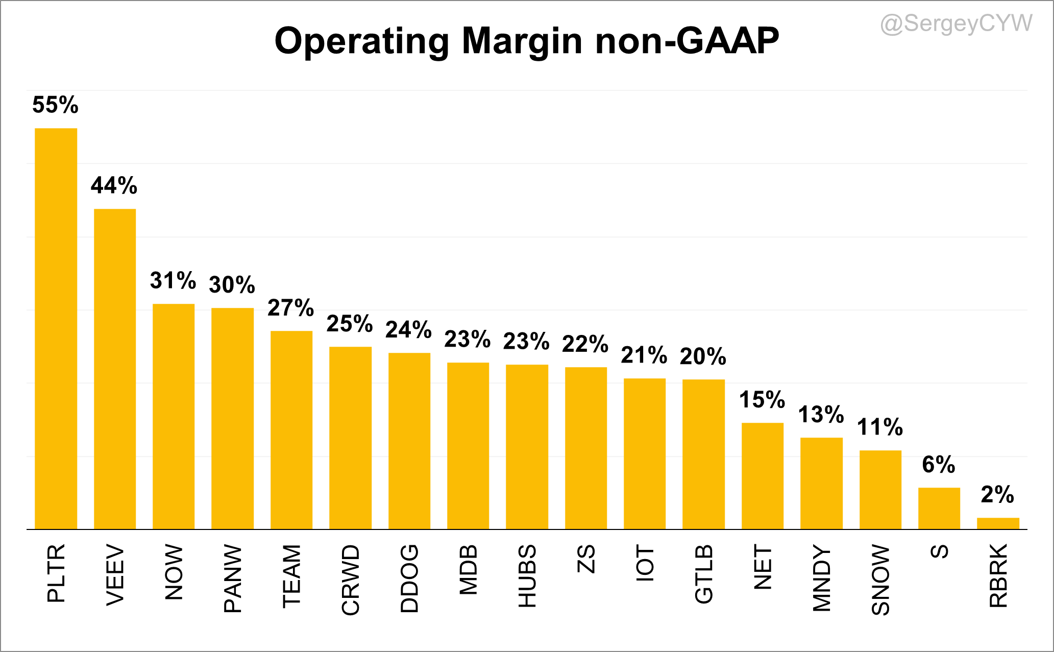 Regarding non-GAAP Operating Margins, the highest performers are $PLTR at 55% and $VEEV at 44%. Next, with strong operating margins, are $PANW, $NOW above 30%.